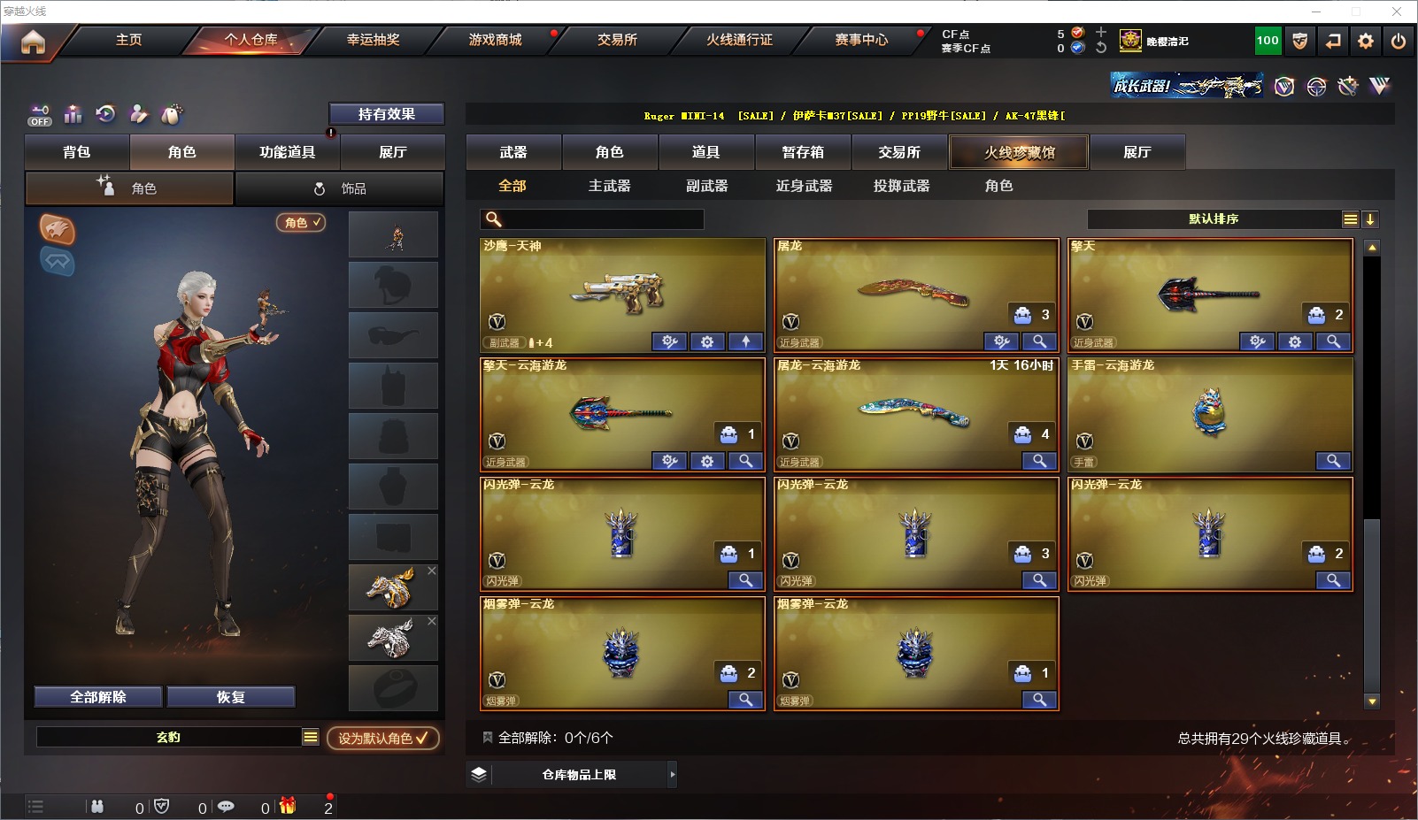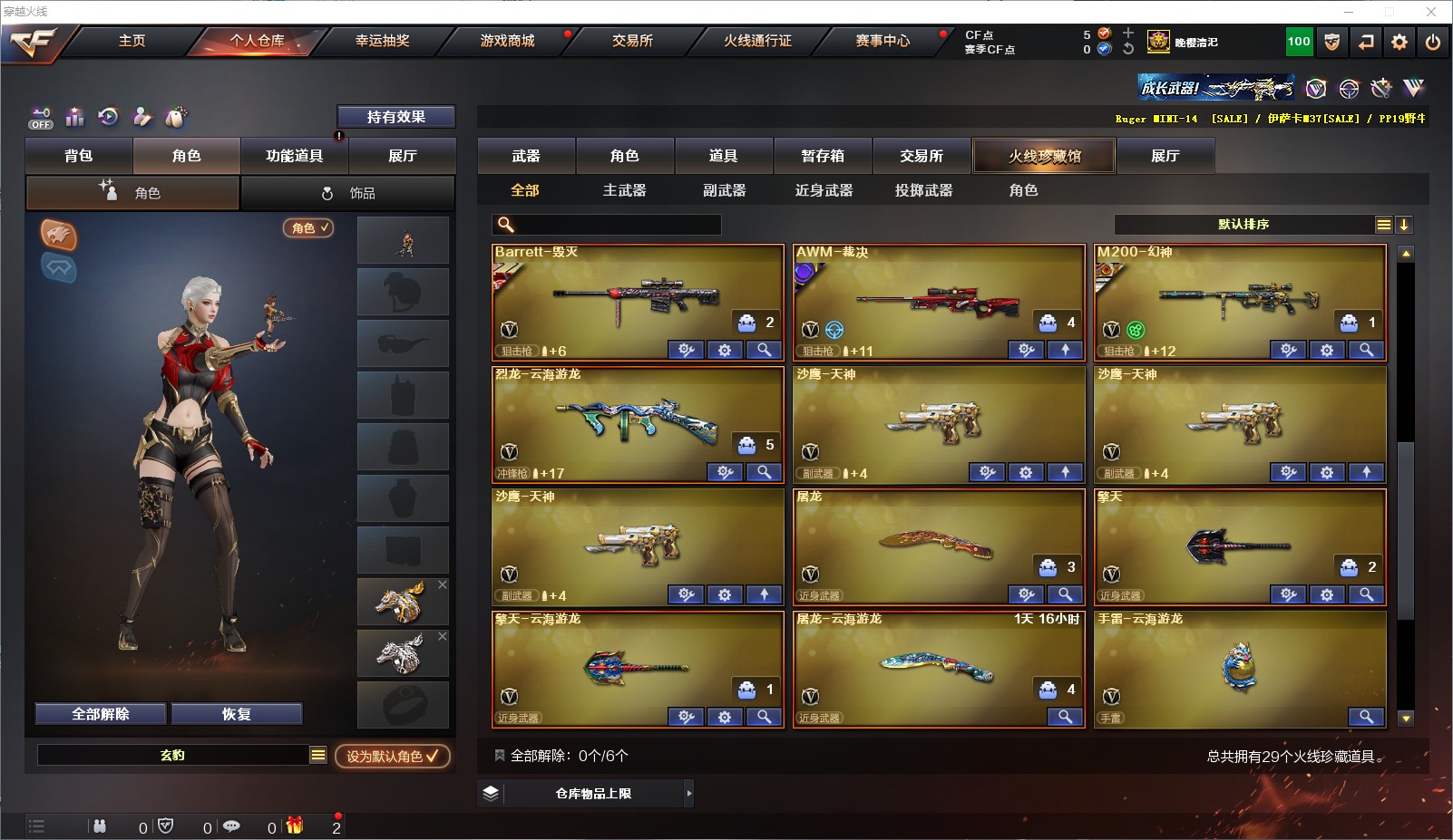 [11497911]3传说角色 1炫金武器 22V武器 可二次 可修改实名 优质装备:M200-幻神,AK47-火麒麟,M4A1-猎神,Barrett-毁灭,AN94-超新星,沙鹰-天神,屠龙,擎天,擎天-云海游龙,AK47-黑武士-锦绣游龙,烈龙-云海游龙 排位资格:有 炫金武器:炫金千变 热门武器:炼狱-枪娘掣电