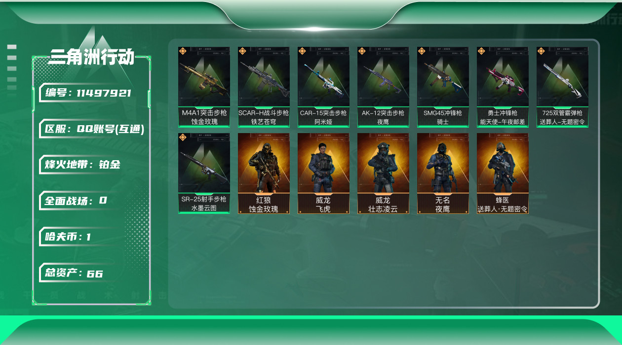 [11497921]总资产:66.5M 5干员外观 8传说枪械 哈夫币:1.580K 可二次 可修改实名 烽火地带段位:铂金 全面战场段位:无段位 传说武器皮肤:SR-25射手步枪-水墨云图,SCAR-H战斗步枪-铁艺苍穹,AK-12突击步枪-夜鹰,SMG45冲锋枪-骑士,CAR-15突击步枪-阿米娅,勇士冲锋枪-能天使-午夜邮差,725双管霰弹枪-送葬人-无题密令,M4A1突击步枪-蚀金玫瑰 干员外观:红狼-蚀金玫瑰,威龙-壮志凌云,无名-夜鹰,威龙-飞虎,蜂医-送葬人·无题密令(S5)