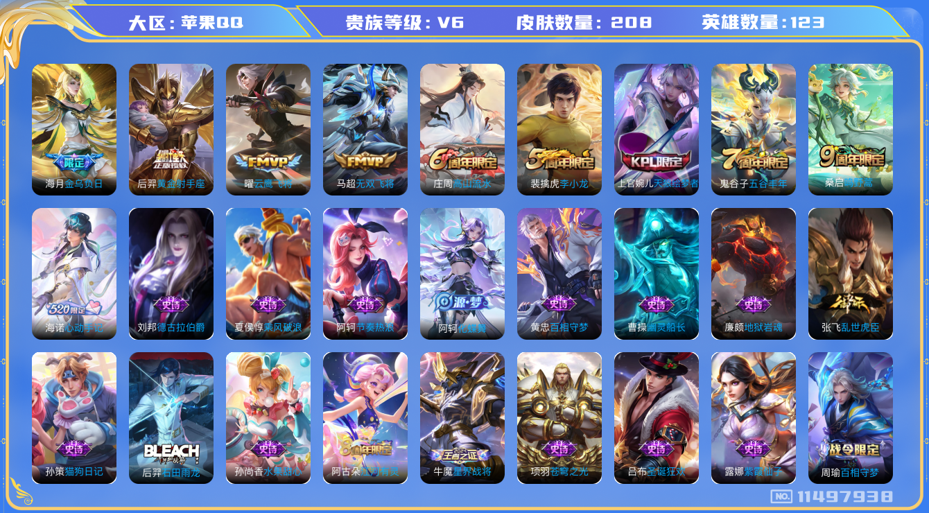 [11497938]V6 5传说 123英雄 208皮肤 可修改实名 优质装备:黄金射手座,云鹰飞将(小将军),无双飞将,金乌负日 珍宝阁皮:女武神,玩趣恶龙 限定皮:鸣野蒿,高山流水,五谷丰年,天狼绘梦者,李小龙 史诗皮:化蝶舞,星界战将,石田雨龙,百相守梦-周瑜,海诺心动手记,百相守梦-黄忠,紫霞仙子,苍穹之光,江河有灵,蒙恬荣光圣徽,偶像歌手,无限星赏官,猫狗日记-孙策,乱世虎臣,节奏热浪,水果甜心,天才门将,星夜王子,功夫厨神,德古拉伯爵,幽灵船长,鬼剑武藏,暗渊魔法,舞动绿茵,地狱岩魂,乘风破浪,逐浪之夏,水晶猎龙者,金属风暴,原初追逐者,圣诞狂欢,圣诞恋歌,鹰眼统帅,暗夜贵公子,魅力维加斯,黎明之约,无心