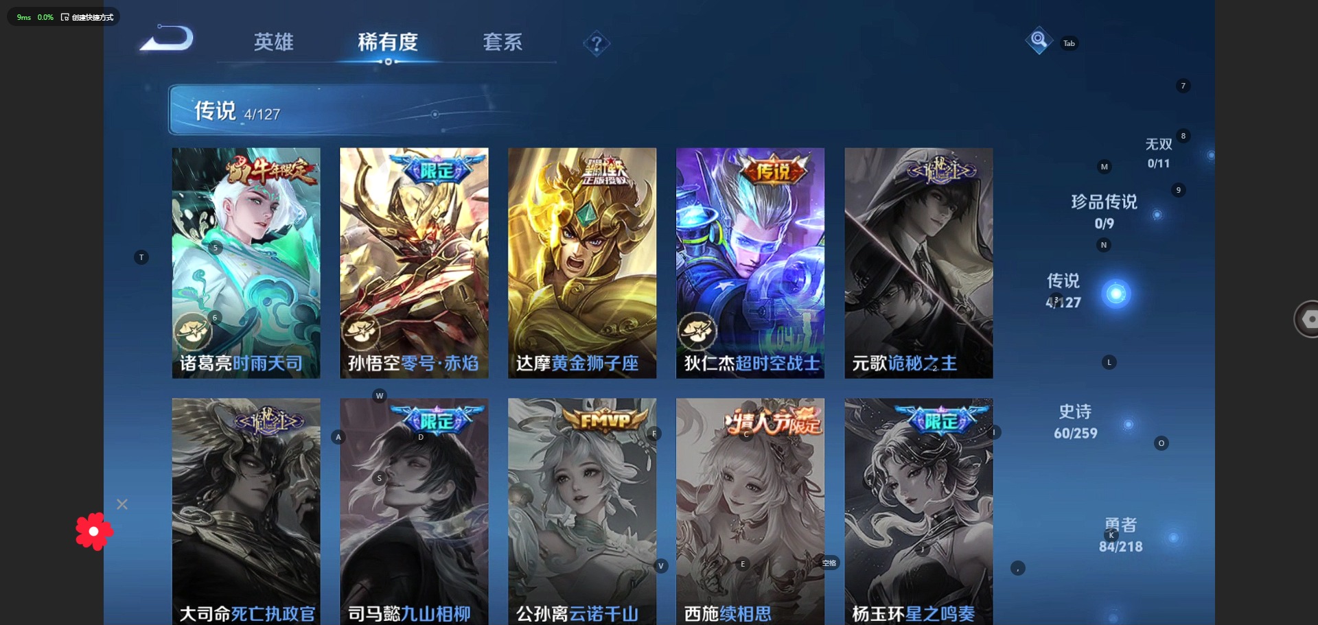 - [11784727]V7 10传说 124英雄 236皮肤 可修改实名 优质装备:黄金白羊座,猫影幻舞,久胜战神,一念神魔,云霓雀翎,仲夏夜之梦(大飞蛾),胖达荣荣,超时空战士-狄仁杰 传说皮:幻光神枪 珍宝阁皮:女武神 限定皮:逐霄战戟,鸣野蒿,遇见飞天,高山流水,五谷丰年,游园惊梦,梁祝,天狼狩猎者,天狼绘梦者,李小龙,朱雀志(守约年限),猪悟能,冰霜恋舞曲 史诗皮:鸭鸭历险记-刘禅,星界战将,小牛鸭,遇见神鹿,紫霞仙子,黄金分割率,特工魅影,江河有灵,完美假期,魅语,偶像歌手,猫狗日记-孙策,时之恋人-孙尚香,修罗,女仆咖啡,水果甜心,天才门将,心灵骇客,功夫厨神,德古拉伯爵,暗隐猎兽者,幽灵船长,鬼剑武藏,乐园奇幻夜,舞动绿茵,地狱岩魂,纤云弄巧,繁星吟游(呼啦呼啦),缤纷独角兽,乘风破浪,逐浪之夏,水晶猎龙者,曙光守护者,金属风暴,原初追逐者,圣诞狂欢,圣诞恋歌,鹰眼统帅,魅力维加斯,黎明之约