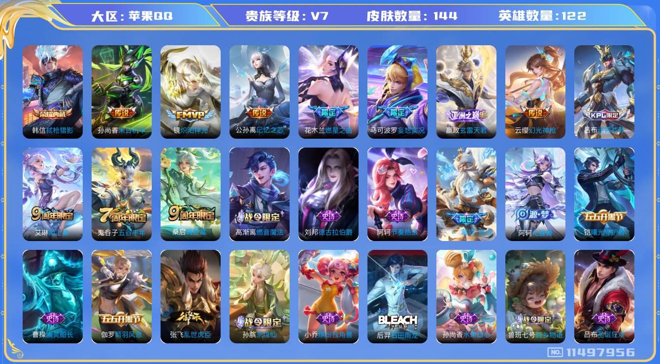 [11497956]V7 1典藏 8传说 122英雄 144皮肤 可修改实名 高渐离小国标 优质装备:弑枪猎影(韩信典藏),炽阳神光,末日机甲-孙尚香(绿蚂蚱),燃星之曲,记忆之芯(机甲兔),妄想实况,玄雷天君 传说皮:幻光神枪 珍宝阁皮:万物之道 限定皮:逐霄战戟,陌上桑,鸣野蒿,五谷丰年 史诗皮:鸭鸭历险记-刘禅,化蝶舞,星界特工,龙之律动,雪豹·霜爪,藏狐·褐绒,布丁狗之誓,石田雨龙,茶境仙,破空之剑,埋骨钱,谪仙醉月,蔬乡物语(鲁班七号),百相守梦-百里守约,紫霞仙子,高渐离燃音魔法,银翎春语,偶像歌手,乱世虎臣,节奏热浪,修罗,水果甜心,天才门将,星夜王子,心灵骇客,功夫厨神,德古拉伯爵,暗隐猎兽者,幽灵船长,鬼剑武藏,乐园奇幻夜,拒霜思,缤纷独角兽,逐浪之夏,曙光守护者,箭羽风息,金属风暴,原初追逐者,圣诞狂欢,圣诞恋歌,鹰眼统帅,暗夜贵公子,魅力维加斯,赏金猎手,未来纪元-赵云