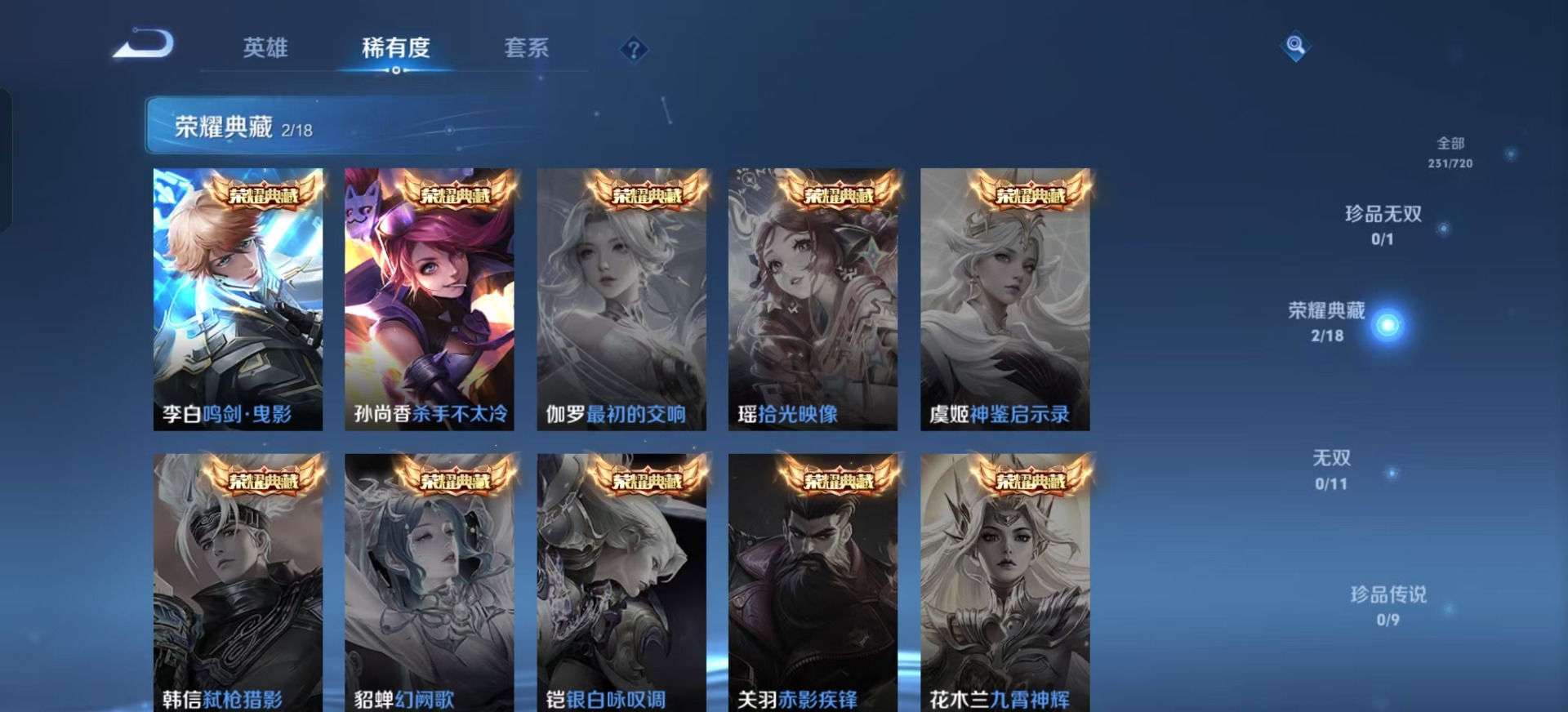 - [11683303]V8 2典藏 1珍品传说 13传说 125英雄 303皮肤 可修改实名 安全保护中 荣耀水晶:银白咏叹调(倪克斯侍卫),全息碎影(猴子典藏) 珍品传说:朽木白哉 传说皮:落雪白狼,幻光神枪,黄金射手座,地狱火,超时空战士-狄仁杰,妄想实况,澜逐花归海 珍宝阁皮:万物之道,优雅恋人 限定皮:愿照·九州拓(澜年限),愿照·岁时盈(虞姬年限),愿照·众生和(妲己年限),至尊宝,飞衡(韩信年限),遇见飞天,高山流水,齐天大圣,游园惊梦,梁祝,御风骁将(吕布年限),龙胆,岱宗(典韦年限),天狼溯光者,天狼征服者,李小龙,默契交锋-花木兰,猪悟能,寅虎·瑞焰(虎皮蛋子),山海·玄木吟(马可年限) 史诗皮:星界战将,茶境仙,器灵·浮梦炉,狼魂孤将,鸭鸭历险记-刘禅,龙之律动,石田雨龙,百相守梦-黄忠,琥珀纪元伽罗,化蝶舞,苍穹之光,电玩小子(小书包),黄金分割率,特工魅影,千年之狐,江河有灵,高渐离燃音魔法,百解令(蒙犽),蒙恬荣光圣徽,青蛇,偶像歌手,晚萤,无限星赏官,电玩·爆裂旋风,百相守梦(刘备),百相守梦(关羽),乱世虎臣,节奏热浪,修罗,女仆咖啡,水果甜心,星夜王子,心灵骇客,功夫厨神,暗隐猎兽者,幽灵船长,鬼剑武藏,心灵战警,舞动绿茵,地狱岩魂,纤云弄巧,繁星吟游(呼啦呼啦),拒霜思,缤纷独角兽,乘风破浪,逐浪之夏,水晶猎龙者,曙光守护者,金属风暴,原初追逐者,圣诞狂欢,圣诞恋歌,鹰眼统帅,魅力维加斯,无心,未来纪元-赵云,玫瑰异探