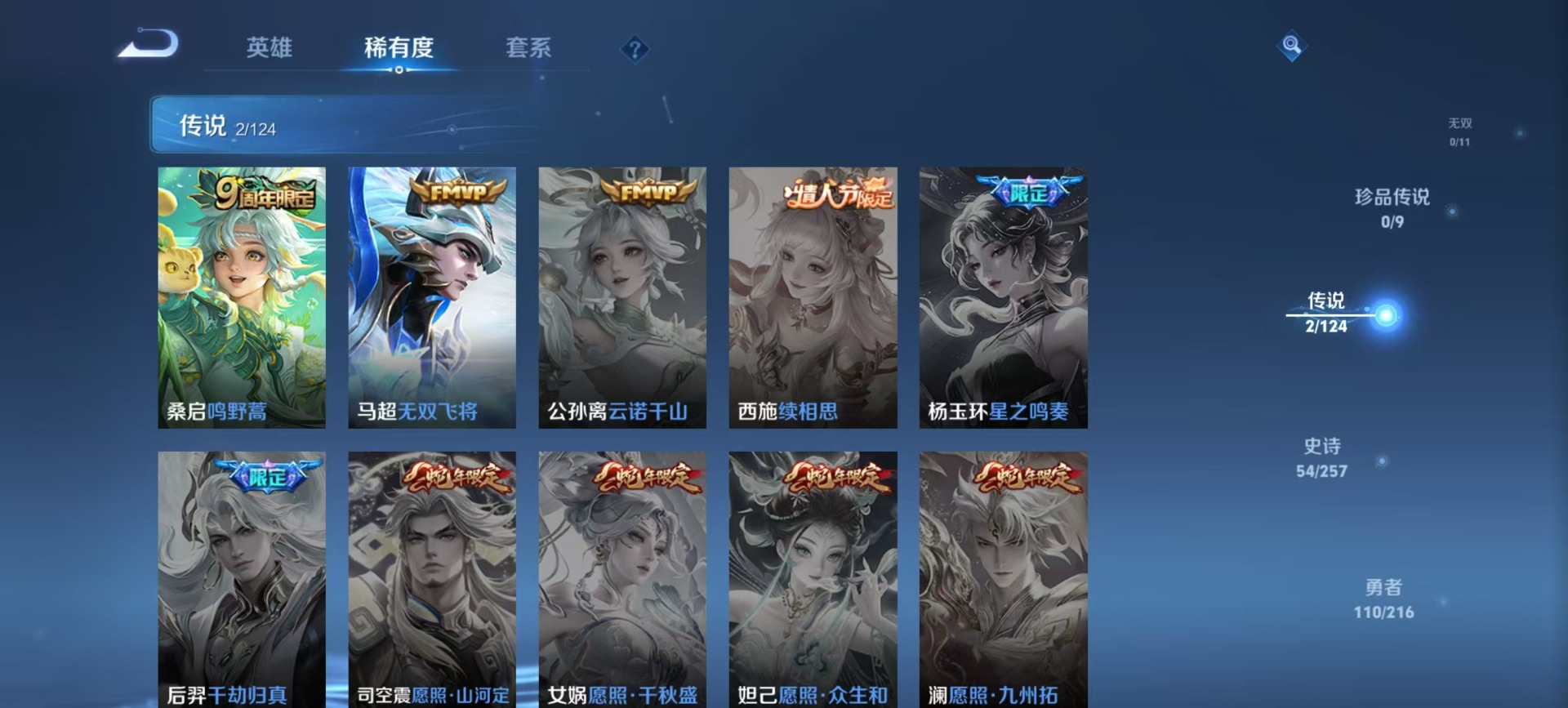 - PX_2097134-26 安卓QQ/无双王者/351皮肤/125英雄/2典藏/0珍品无双/0无双/2珍品传说/33传说/116史诗/9稀有英雄 【2 珍品传说】酷洛米之心 安琪拉,时之奇旅 孙策, 【2 典藏皮肤】九霄神辉 花木兰,星域神启 诸葛亮, 【33 传说皮肤】武圣 关羽,启明星使 虞姬,碎云 百里守约,逐花归海 澜,电玩·雷克斯 澜,云鹰飞将 曜,诗剑行 李白,燃星之曲 花木兰,浮生妄