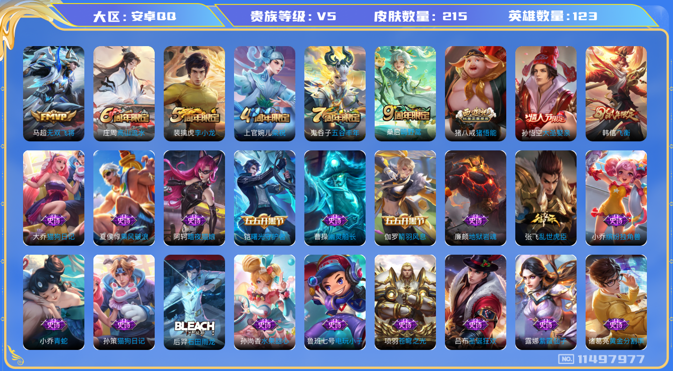 [11497977]V5 2传说 123英雄 215皮肤 可修改实名 传说皮:无双飞将 珍宝阁皮:妄想食味,蔷薇恋人,玩趣恶龙 限定皮:鸣野蒿,飞衡(韩信年限),高山流水,五谷丰年,梁祝,李小龙,猪悟能,大圣娶亲 史诗皮:石田雨龙,紫霞仙子,苍穹之光,电玩小子(小书包),黄金分割率,特工魅影,千年之狐,蒙恬荣光圣徽,青蛇,无限星赏官,暗夜猫娘,猫狗日记-孙策,猫狗日记-大乔,乱世虎臣,修罗,女仆咖啡,水果甜心,绅士熊喵,心灵骇客,功夫厨神,暗隐猎兽者,幽灵船长,鬼剑武藏,心灵战警,地狱岩魂,纤云弄巧,缤纷独角兽,乘风破浪,逐浪之夏,水晶猎龙者,曙光守护者,箭羽风息,金属风暴,原初追逐者,圣诞狂欢,圣诞恋歌,鹰眼统帅,魅力维加斯,黎明之约,无心,未来纪元-赵云