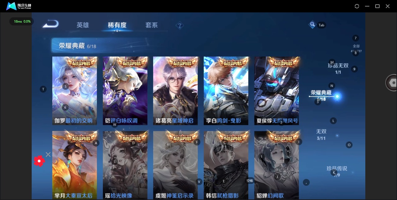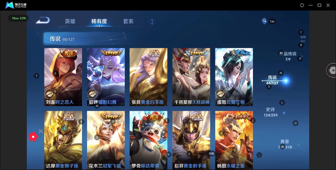 - PX_2099956-Q/至尊星耀/257皮肤/122英雄/0典藏/0珍品无双/0无双/0珍品传说/18传说/64史诗/7稀有英雄 【18 传说皮肤】胖达荣荣 梦奇,启明星使 虞姬,逐花归海 澜,无双飞将 马超,齐天大圣 孙悟空,猫影幻舞 貂蝉,地狱之眼 宫本武藏,炽阳神光 镜,黄金射手座 后羿,怒海麟威 吕布,黄金狮子座 达摩,久胜战神 干将莫邪,山海·炽霜斩 李信,一念神魔 李信,音你心动 小