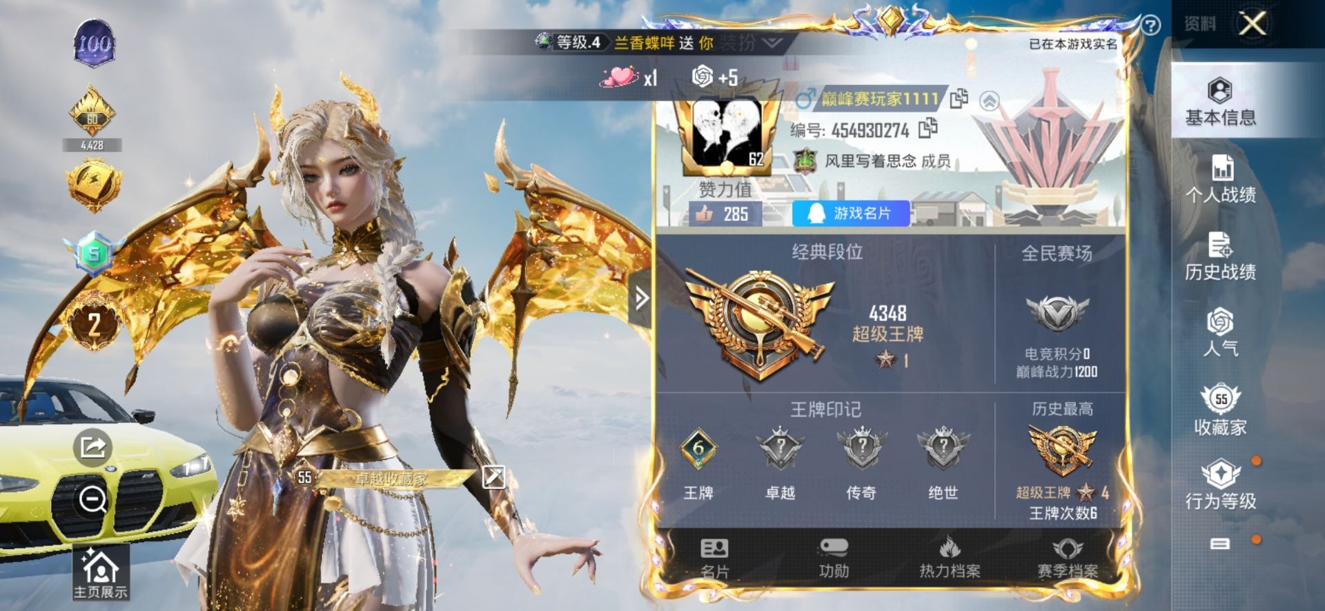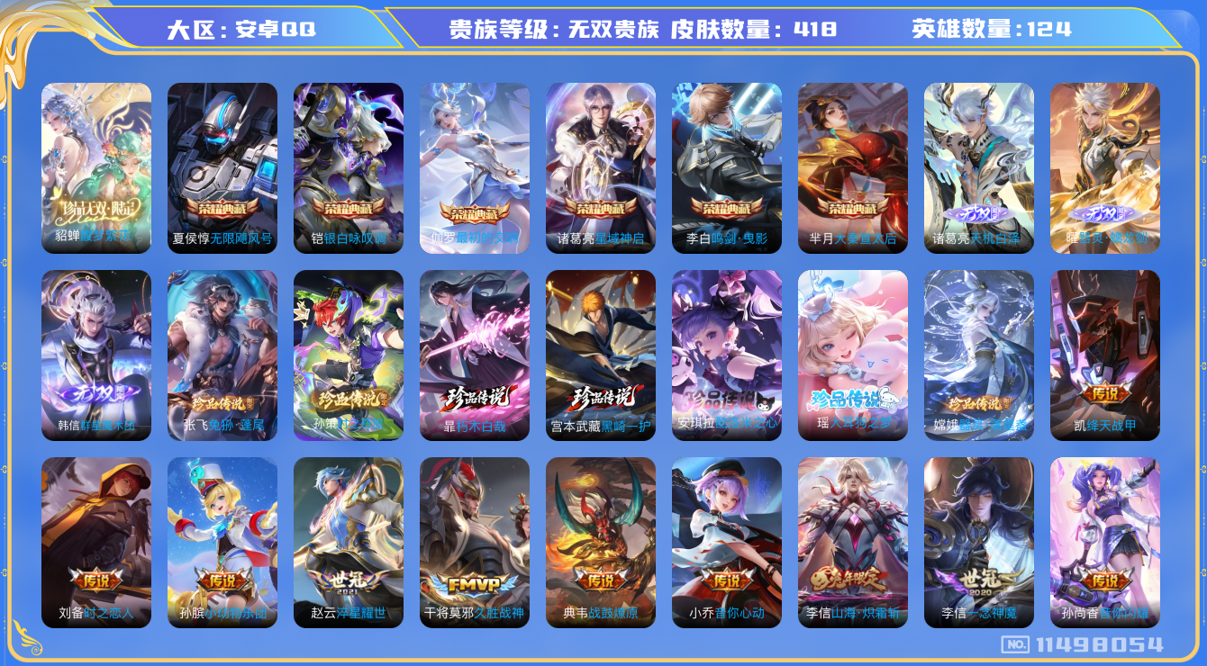 [11498054]无双贵族 6典藏 1珍品无双 3无双 7珍品传说 66传说 124英雄 418皮肤 可修改实名 连体和平 优质装备:馥梦繁花,无限飓风号(高达),大秦宣太后,鸣剑·曳影,星域神启(倪克斯贼亮),银白咏叹调(倪克斯侍卫),韩信群星魔术团(韩信无双),器灵·螭龙剑,最初的交响(伽罗典藏),天机白泽,器灵·落星盏,酷洛米之心,大耳狗之梦,朽木白哉,黑崎一护,黄金狮子座,黄金射手座,冠军飞将,云鹰飞将(小将军),绛天战甲(鸡嘴战神),黄金白羊座,猫影幻舞,久胜战神,炽阳神光,一念神魔,云霓雀翎,末日机甲-孙尚香(绿蚂蚱),地狱火,仲夏夜之梦(大飞蛾),音你心动-小乔,海洋之心,地狱之眼,飞鸢探春,音你心动-周瑜,胖达荣荣,乞巧织情,时之恋人-刘备(电焊工),游龙清影(小青龙),淬星耀世,超时空战士-狄仁杰,末日机甲-孙策,花朝如约(花篮子),无双飞将,音你闪耀(rap皮),碎云,山海·炽霜斩(李信年限),记忆之芯(机甲兔),电玩·雷克斯,鹤羽星尊,灼幽烈阳,妄想实况,惊梅引,小动物乐团,霜月吟,澜逐花归海,艾琳觅芳踪,牧神诗旅,千劫归真 珍品传说:时之奇旅-孙策,兔狲·蓬尾 传说皮:典韦战鼓燎原,落雪白狼,死亡执政官,九山相柳,云诺千山,星之鸣奏,祥瑞亨通,幻光神枪 珍宝阁皮:万物之道,优雅恋人,玩趣恶龙 限定皮:愿照·九州拓(澜年限),愿照·福禄聚(蔡文姬年限),愿照·岁时盈(虞姬年限),愿照·山河定(司空震年限),愿照·众生和(妲己年限),愿照·千秋盛(女娲年限),鸣野蒿,寅虎·展翼(孙膑年限),白鹤梁神女,至美·乘鲤谣,至美·化雀舞,遇见飞天,高山流水,诗剑行,怒海麟威,降魔,五谷丰年,天狼运算者,天狼溯光者,祈雪灵祝(雪兔子),李小龙,永曜之星,辉光之辰,猪悟能,大圣娶亲,青春决赛季,寅虎·御盾(廉颇年限),寅虎·瑞焰(虎皮蛋子),寅虎·心曲(虎婆),寅虎·赤拳(老虎年限),百木心枪,时之奇旅-妲己,神器·万象笔,山海·玄木吟(马可年限),冰霜神祇 史诗皮:赞萌露比,鸭鸭历险记-刘禅,飞车小橘子,苍鳞隐世,器灵·浮梦炉,糖绘人间,狼魂孤将,绮世丹青,瑰影绮梦,化蝶舞,星界特工,灵蛊蚀心,龙之律动,雪豹·霜爪,藏狐·褐绒,布丁狗之誓,小牛鸭,石田雨龙,百相守梦-周瑜,戍鼓铭心,茶境仙,幻珠鲛人,怒海争锋,夜落电台,蔬乡物语(鲁班七号),琥珀纪元伽罗,守夜人