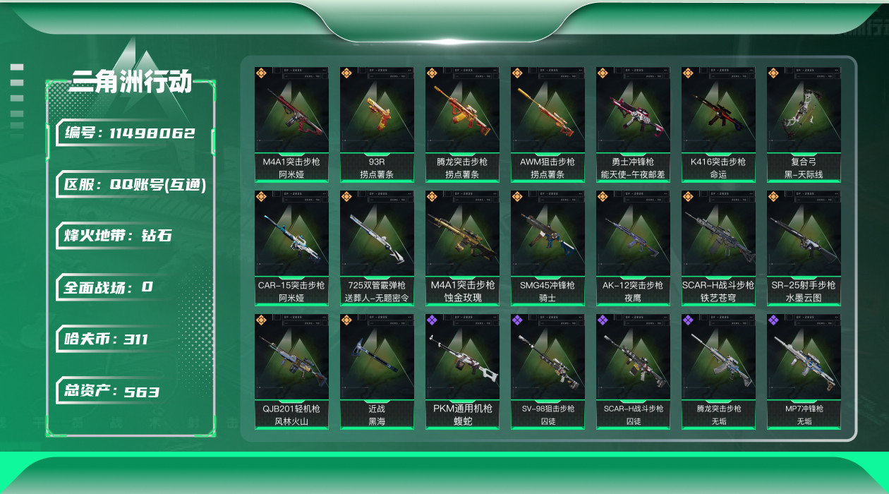 [11498062]总资产:563.2M 6干员外观 1近战传说 16传说枪械 哈夫币:311K 可二次 可修改实名 优质装备:近战-黑海,K416突击步枪-命运(典藏),顶级安全箱(3x3) 烽火地带段位:钻石 全面战场段位:上等兵 传说武器皮肤:QJB201轻机枪-风林火山,SR-25射手步枪-水墨云图,SCAR-H战斗步枪-铁艺苍穹,AK-12突击步枪-夜鹰,SMG45冲锋枪-骑士,M4A1突击步枪-阿米娅,CAR-15突击步枪-阿米娅,复合弓-黑-天际线,AWM狙击步枪-捞点薯条,腾龙突击步枪-捞点薯条,93R-捞点薯条,勇士冲锋枪-能天使-午夜邮差,725双管霰弹枪-送葬人-无题密令,M4A1突击步枪-蚀金玫瑰 史诗武器皮肤:Ash-12战斗步枪-飓风行动,QBZ95-1突击步枪-ACE,M4A1突击步枪-特勤执行,AUG突击步枪-特勤执行,Vector冲锋枪-红色彗星,PTR-32战斗步枪-ACE,M700狙击步枪-蝮蛇,PKM通用机枪-蝮蛇,SR-25射手步枪-战场英杰,Ash-12战斗步枪-守夜人,SVD狙击步枪-暗夜猎手,PKM通用机枪-守夜人,AS Val突击步枪-尖端治疗,M700狙击步枪-守夜人,SG552突击步枪-尖端治疗,MP5冲锋枪-深海恐惧,SG552突击步枪-深海恐惧,AKM突击步枪-林中猎手,.357左轮-幸运时刻,SR-3M紧凑突击步枪-荒野求生,SV-98狙击步枪-林中猎手,PTR-32突击步枪-英雄,SVD狙击步枪-荒野求生,AS Val突击步枪-典狱官,M250通用机枪-囚徒,SV-98狙击步枪-囚徒,SCAR-H战斗步枪-囚徒,腾龙突击步枪-无垢,MP7冲锋枪-无垢,PSG-1射手步枪-无垢,M14射手步枪-黑鹰坠落,沙漠之鹰-曙光,Vector冲锋枪-阿萨拉文明,S12K霰弹枪-曙光,PKM通用机枪-英雄,QSZ92G-风林火山 干员外观:红狼-蚀金玫瑰,威龙-壮志凌云,无名-夜鹰,威龙-飞虎,蜂医-送葬人·无题密令(S5),露娜-黑·天际线