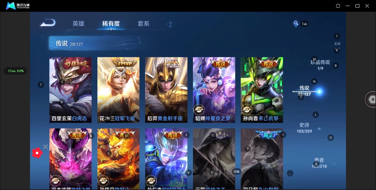 - [11579465]V7 1典藏 6传说 124英雄 210皮肤 可修改实名 优质装备:鸣剑·曳影,地狱之眼,时之恋人-刘备(电焊工),画中仙 传说皮:云诺千山,幻光神枪 珍宝阁皮:万物之道,蔷薇恋人 限定皮:愿照·千秋盛(女娲年限),遇见飞天,高山流水,五谷丰年,冰锋战神,孙行者,猪悟能,女儿国国王 史诗皮:器灵·浮梦炉,化蝶舞,龙之律动,藏狐·褐绒,戍鼓铭心,茶境仙,破空之剑,战舞者,谪仙醉月,百相守梦-百里守约,百相守梦-黄忠,紫霞仙子,苍穹之光,黄金分割率,电玩·爆裂旋风,江河有灵,蒙恬荣光圣徽,偶像歌手,魅语,冰冠公主,猫狗日记-孙策,猫狗日记-大乔,乱世虎臣,女仆咖啡,摇滚巨星,水果甜心,天才门将,星夜王子,时之奇旅-安琪拉,功夫厨神,德古拉伯爵,暗隐猎兽者,幽灵船长,鬼剑武藏,心灵战警,乐园奇幻夜,天秀·启明,地狱岩魂,拒霜思,缤纷独角兽,乘风破浪,水晶猎龙者,曙光守护者,金属风暴,原初追逐者,圣诞狂欢,圣诞恋歌,鹰眼统帅,暗夜贵公子,天秀·音浪,未来纪元-赵云