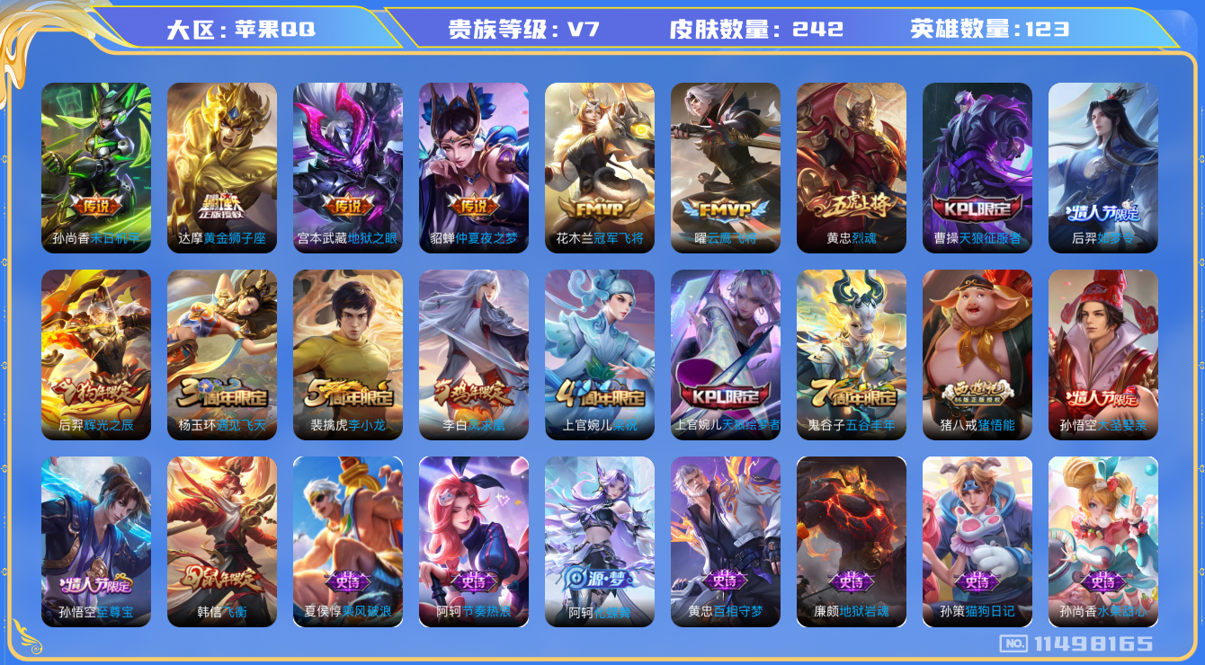 [11498165]V7 7传说 123英雄 242皮肤 可修改实名 传说皮:黄金狮子座,仲夏夜之梦(大飞蛾),地狱之眼,末日机甲-孙尚香(绿蚂蚱),冠军飞将,云鹰飞将(小将军) 珍宝阁皮:女武神 限定皮:至尊宝,凤求凰(白切鸡),飞衡(韩信年限),遇见飞天,五谷丰年,梁祝,烈魂,天狼征服者,天狼绘梦者,李小龙,辉光之辰,如梦令-后羿,猪悟能,大圣娶亲 史诗皮:龙之律动,百相守梦-黄忠,化蝶舞,白龙吟,黄金分割率,特工魅影,千年之狐,冰冠公主,偶像歌手,龙骑士(小龙虾),猫狗日记-孙策,节奏热浪,摇滚巨星,水果甜心,星夜王子,暗隐猎兽者,地狱岩魂,纤云弄巧,繁星吟游(呼啦呼啦),乘风破浪,逐浪之夏,水晶猎龙者,原初追逐者,圣诞狂欢,鹰眼统帅,魅力维加斯,黎明之约,无心,未来纪元-赵云