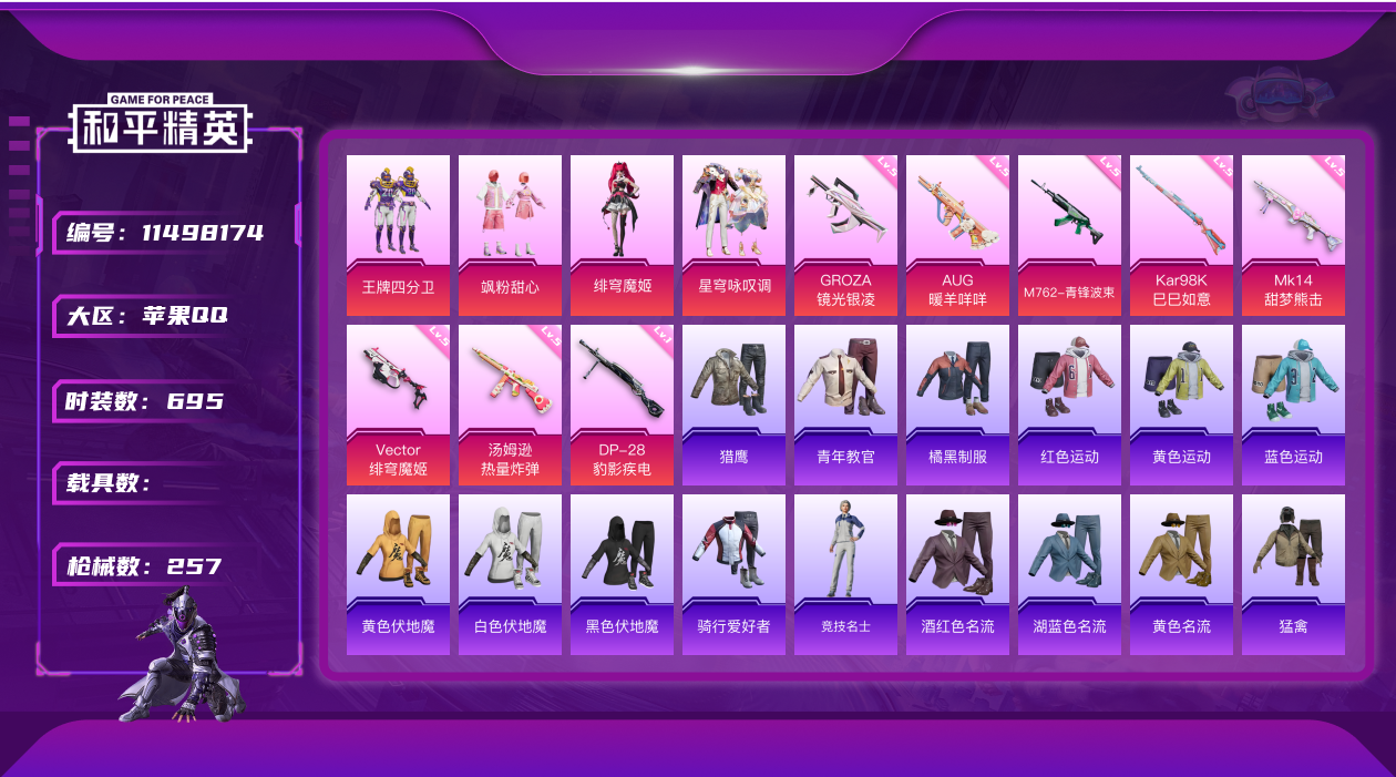 [11498174]4粉装 8特效枪 15印记 可二次 身法装备:Mark.06(新蓝螳螂) 优质装备:王牌四分卫,M762-青锋波束,GROZA-镜光银凌,AUG-暖羊咩咩,星穹咏叹调,MK14-甜梦熊击,汤姆逊-热量炸弹,绯穹魔姬,Vector-绯穹魔姬,Kar98K-巳巳如意 热门装扮:飒粉甜心 五级特效枪:五级M762-青锋波束,五级GROZA-镜光银凌,五级Kar98K-巳巳如意,五级汤姆逊-热量炸弹,五级Vector-绯穹魔姬,五级MK14-甜梦熊击,五级AUG-暖羊咩咩 一级特效枪:一级DP-28-豹影疾电 紫色装扮:田园牧歌,轻风白浪,SS22特训,和煦暖阳,妙红点点,灵蜜圈圈,幻彩翩翩,SS23特训,娇憨猪猪,萌趣咩咩,SS21特训,SS30特训套装,军械专家,人气偶像,冰川特警,冷焰舞者,北国孤狼,千禧之恋,霓虹热舞,SS20特训,SS31特训套装,云朵鹅,彩虹兔,雪绒豹,SS33特训套装,顶瓜瓜,潮流游乐家,SS15特训,快乐星愿,爆裂葡萄,镭射皇者,银白舞王,SS13特训,超能拳王,治愈之星,迅捷之星,科技之星,SS14特训,虚音幻奏,飞驰魅影,音速流光,极速竞梦,SS19特训,甜心亚梦,电音精灵,瑞龙福将,团圆交子,SS17特训,智慧隐士,异彩先驱,缤纷焰火,SS18特训,吉莉礼服,长空猛禽,都市魅力,酒红色名流,酷潮明星,酷萌兔限定,野性战心,霓虹极客,霓虹街区,青年教官,缤纷果语,荣耀,蓝彩潮人,蓝色运动,虎虎生威吉莉,街头潮人,跃动心情,绛羽幽主,龙的传人,飞行日记,骑行爱好者,魅力单车,鹤鸣,麻辣教官,黄色伏地魔,黄色名流,黄色运动,黑色伏地魔,龙腾端午,龟仙人,冰河战士,龙魂突击队,蝶变,香桃花海,绮丽涂鸦,极速红龙,柠萌假日,格斗先锋,橘黑制服,沙漠兵团,海岛探路者,涂山之恋,深蓝色名流,暗金炫舞,湖蓝色名流,幻世战舞者,夏日音浪,完美偶像,帅气教官,幻影武者,战地督导,探宝勇士,滨海假日,甜蜜熊情侣,白熊同盟,白色伏地魔,破晓战魂,破蛋小黄鸡,王牌教练,空投萌叽,竞技勇士朋克,竞技达人朋克,红色运动,甜蜜告白,猛禽,滨海厨神,灰色格斗者,灼焰舞者,炫蓝之夏,牛气冲天,猎鹰,牛气满满,小熊娃娃,雏菊兔兔,萝兰蝴蝶,SS29特训,纯真浪花,热情海星,SS28特训,Mark.06(新蓝螳螂),创世·追猎,星途旅人,巳巳如意,异域银装,鱼渊荷华,玉兔迎