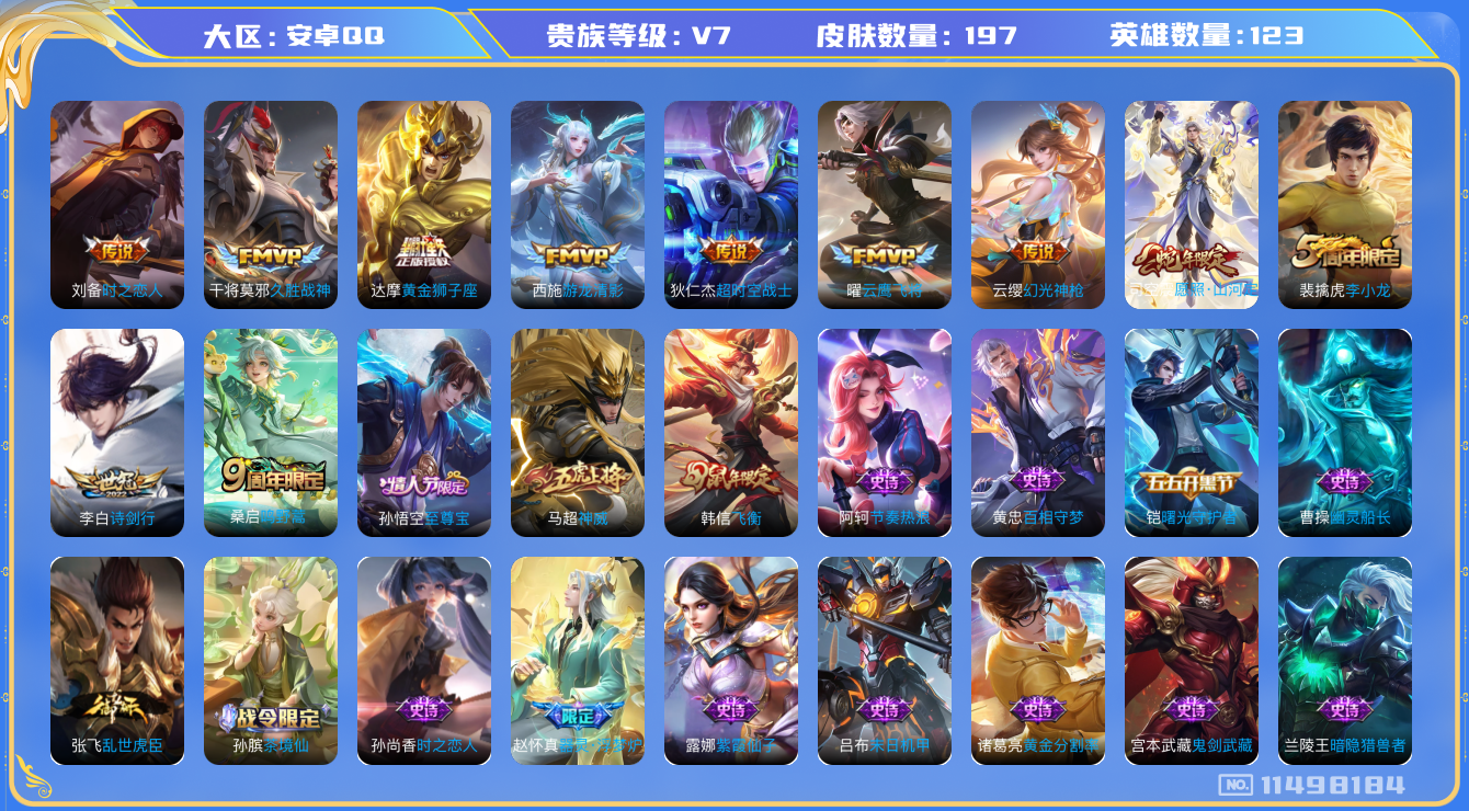 [11498184]V7 10传说 123英雄 197皮肤 可修改实名 传说皮:幻光神枪,游龙清影(小青龙),黄金狮子座,久胜战神,云鹰飞将(小将军),时之恋人-刘备(电焊工),超时空战士-狄仁杰 珍宝阁皮:万物之道,蔷薇恋人 限定皮:愿照·山河定(司空震年限),鸣野蒿,至尊宝,神威(电光马子),飞衡(韩信年限),诗剑行,李小龙 史诗皮:茶境仙,器灵·浮梦炉,龙之律动,百相守梦-黄忠,紫霞仙子,白龙吟,黄金分割率,特工魅影,千年之狐,偶像歌手,晚萤,末日机甲-吕布,时之恋人-孙尚香,乱世虎臣,节奏热浪,修罗,摇滚巨星,星夜王子,暗隐猎兽者,幽灵船长,鬼剑武藏,纤云弄巧,繁星吟游(呼啦呼啦),拒霜思,逐浪之夏,水晶猎龙者,曙光守护者,热力回旋,金属风暴,原初追逐者,鹰眼统帅,黎明之约
