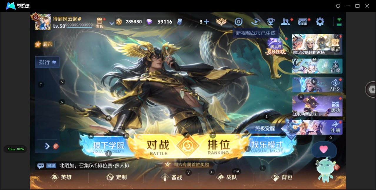 - [11647753]V6 9传说 39英雄 29皮肤 可修改实名 优质装备:黄金射手座,绛天战甲(鸡嘴战神),炽阳神光,一念神魔,地狱之眼,乞巧织情,淬星耀世,无双飞将 限定皮:至尊宝,诗剑行 史诗皮:紫霞仙子,水果甜心,天才门将,逐浪之夏,魅力维加斯,赏金猎手
