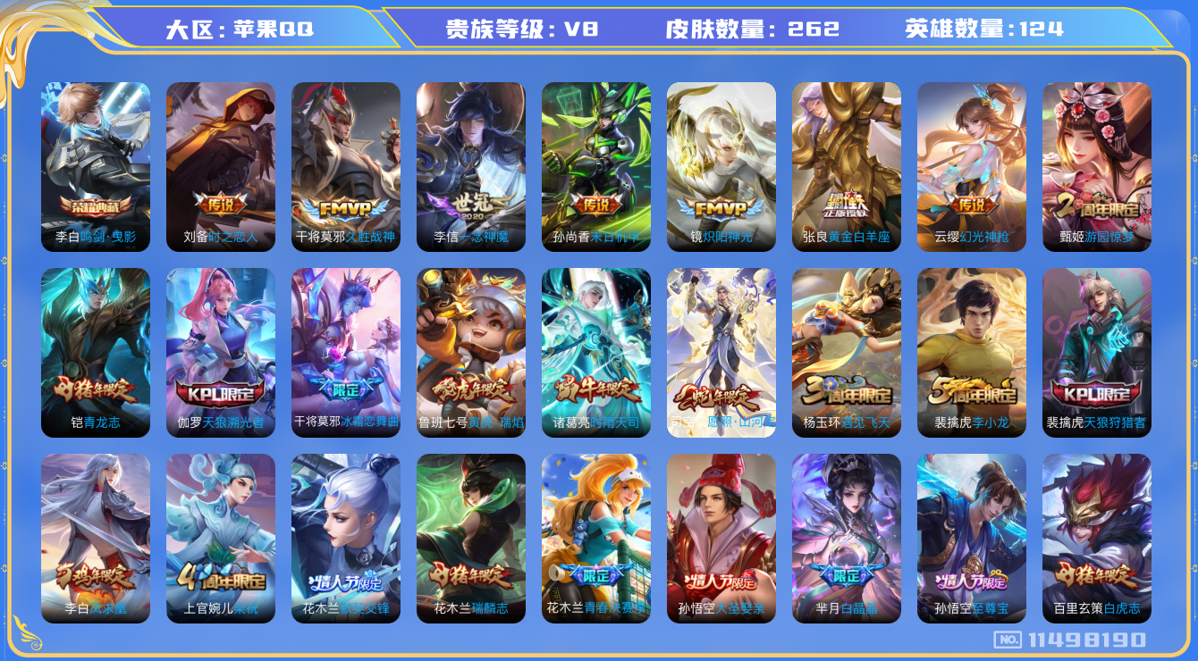 - [11604185]V8 2典藏 18传说 125英雄 294皮肤 可修改实名 优质装备:鸣剑·曳影,弑枪猎影(韩信典藏),黄金狮子座,绛天战甲(鸡嘴战神),炽阳神光,末日机甲-孙尚香(绿蚂蚱),地狱火,仲夏夜之梦(大飞蛾),胖达荣荣,时之恋人-刘备(电焊工),淬星耀世,超时空战士-狄仁杰,碎云 珍宝阁皮:妄想食味,女武神 限定皮:鸣野蒿,至尊宝,白虎志(电光耗子),凤求凰(白切鸡),神威(电光马子),飞衡(韩信年限),诗剑行,齐天大圣,怒海麟威,冰锋战神,梁祝,天狼绘梦者,李小龙,朱雀志(守约年限),山海·玄木吟(马可年限),冰霜神祇 史诗皮:鸭鸭历险记-刘禅,化蝶舞,龙之律动,百相守梦-周瑜,茶境仙,百相守梦-黄忠,紫霞仙子,电玩小子(小书包),白龙吟,黄金分割率,特工魅影,千年之狐,永昼,电玩·爆裂旋风,真我赫兹(百里守约),蒙恬荣光圣徽,偶像歌手,无限星赏官,晚萤,冰冠公主,末日机甲-吕布,猫狗日记-孙策,时之恋人-孙尚香,乱世虎臣,节奏热浪,修罗,女仆咖啡,摇滚巨星,水果甜心,绅士熊喵,星夜王子,心灵骇客,功夫厨神,德古拉伯爵,暗隐猎兽者,幽灵船长,鬼剑武藏,舞动绿茵,纤云弄巧,繁星吟游(呼啦呼啦),缤纷独角兽,逐浪之夏,水晶猎龙者,曙光守护者,热力回旋,箭羽风息,唤灵魅影,金属风暴,原初追逐者,圣诞恋歌,鹰眼统帅,暗夜贵公子,魅力维加斯,奇遇舞章,无心,未来纪元-赵云