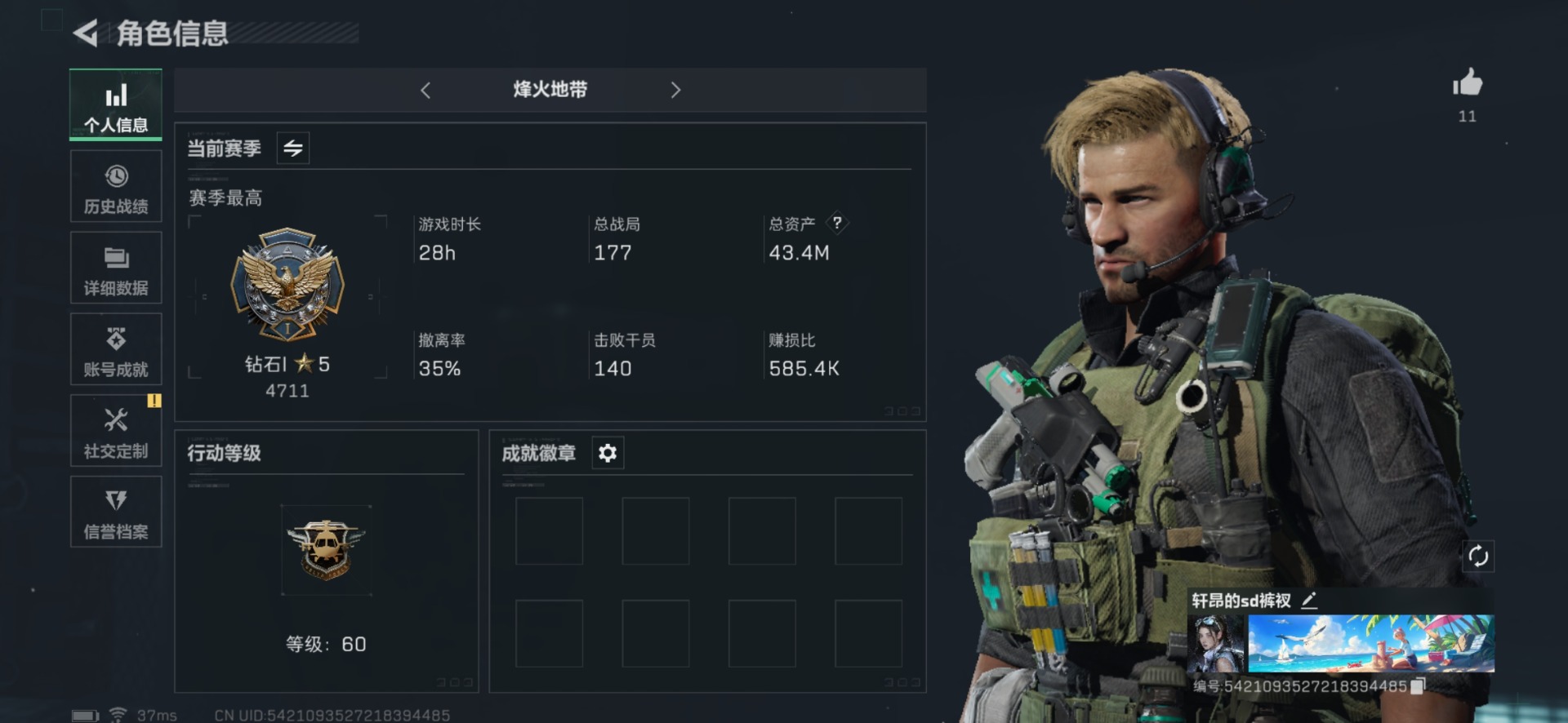 [11498221]可二次 可修改实名 实名:可修改 进阶安全箱(2×2)9.15号到期 烽火地带段位:钻石 全面战场段位:上等兵 总资产:43.4 哈夫币:31.196 传说武器皮肤:AK-12突击步枪-夜鹰,复合弓-黑-天际线,CAR-15突击步枪-阿米娅,M4A1突击步枪-蚀金玫瑰 干员外观:红狼-蚀金玫瑰