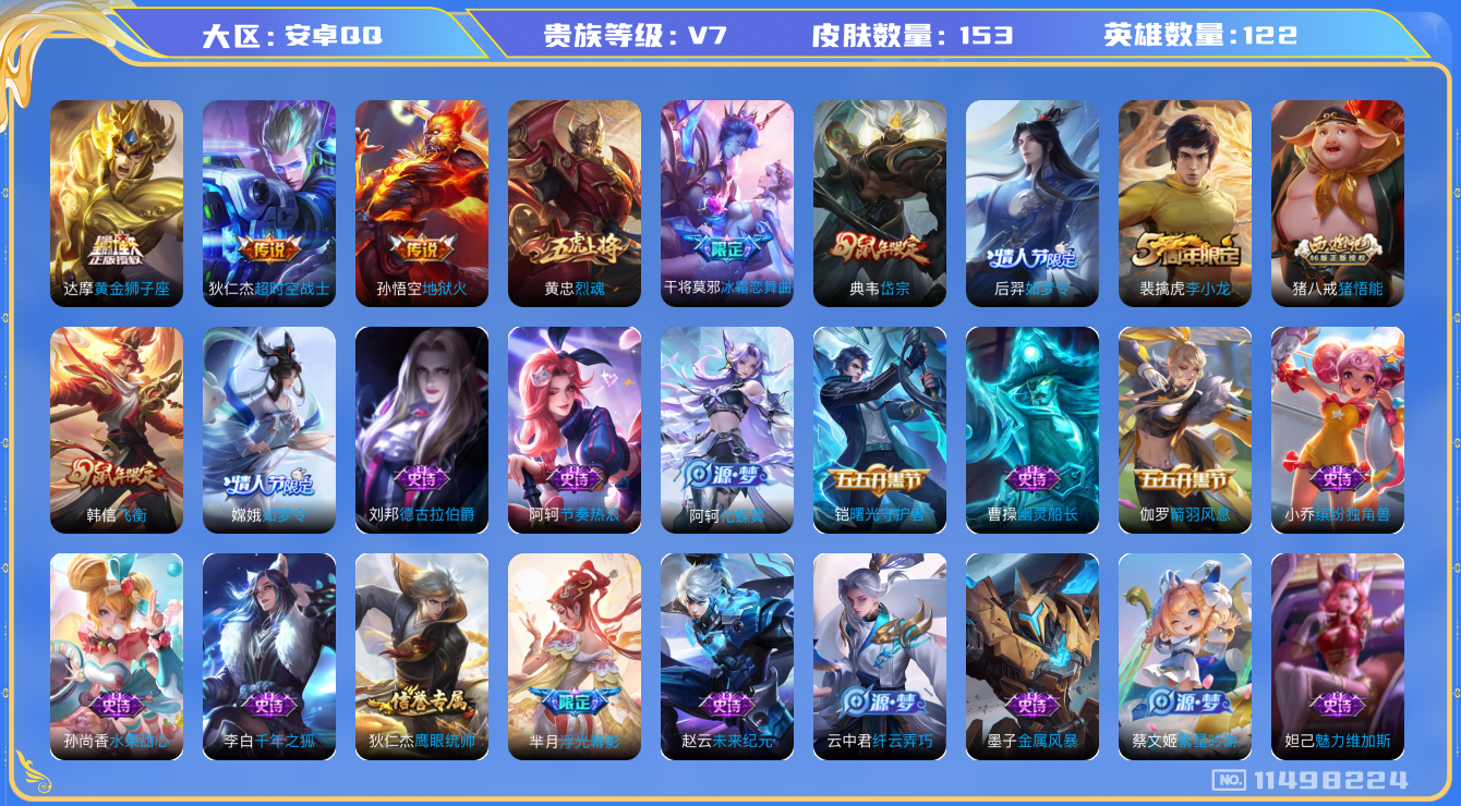 [11498224]V7 3传说 122英雄 153皮肤 可修改实名 优质装备:黄金狮子座,地狱火,超时空战士-狄仁杰 珍宝阁皮:优雅恋人 限定皮:飞衡(韩信年限),烈魂,岱宗(典韦年限),李小龙,如梦令-嫦娥,如梦令-后羿,猪悟能,冰霜恋舞曲 史诗皮:化蝶舞,芈月浮光幕影,千年之狐,节奏热浪,水果甜心,德古拉伯爵,幽灵船长,纤云弄巧,繁星吟游(呼啦呼啦),缤纷独角兽,曙光守护者,箭羽风息,金属风暴,鹰眼统帅,魅力维加斯,未来纪元-赵云