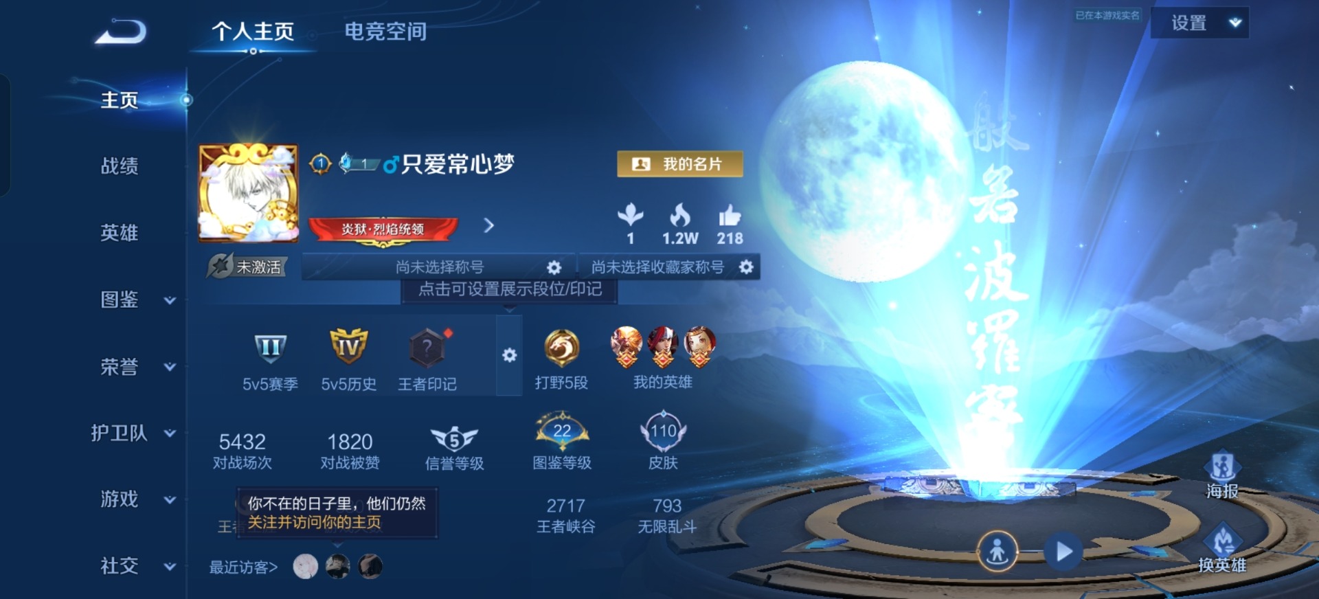 - PX_2054271-贵族等级: V7 英雄数: 117 皮肤数: 160 荣耀水晶: 神鉴启示录 无双皮: 雪境奇遇-甄姬 传说皮: 浮生妄,幻光神枪 限定皮: 李小龙,游园惊梦,梁祝,至尊宝,高山流水,孙行者,傲雪梅枪,五谷丰年,降魔,愿照·众生和,愿照·山河定,愿照·岁时盈