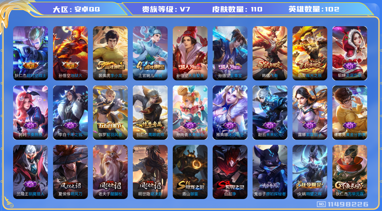 [11498226]V7 2传说 102英雄 110皮肤 可修改实名 传说皮:地狱火,超时空战士-狄仁杰 限定皮:至尊宝,飞衡(韩信年限),梁祝,李小龙,辉光之辰,大圣娶亲 史诗皮:紫霞仙子,黄金分割率,千年之狐,冰冠公主,节奏热浪,水果甜心,箭羽风息,圣诞恋歌,鹰眼统帅,未来纪元-赵云