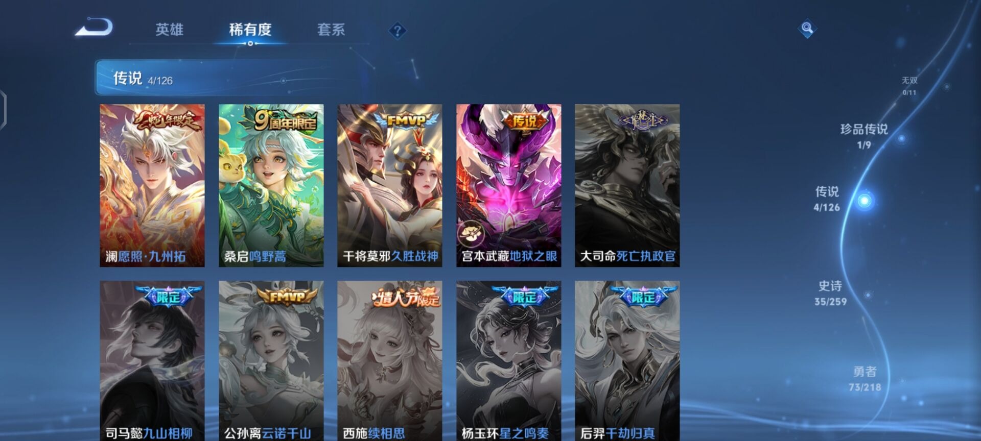 - PX_2097277-49 安卓QQ/至尊星耀/276皮肤/125英雄/1典藏/0珍品无双/1无双/3珍品传说/23传说/85史诗/9稀有英雄 【3 珍品传说】黑崎一护 宫本武藏,怪盗基德 马可波罗,时之奇旅 孙策, 【1 典藏皮肤】幻阙歌 貂蝉, 【1 无双皮肤】器灵·螭龙剑 曜, 【23 传说皮肤】启明星使 虞姬,云霓雀翎 虞姬,逐花归海 澜,云鹰飞将 曜,游龙清影 西施,猫影幻舞 貂蝉,地狱