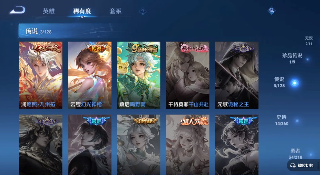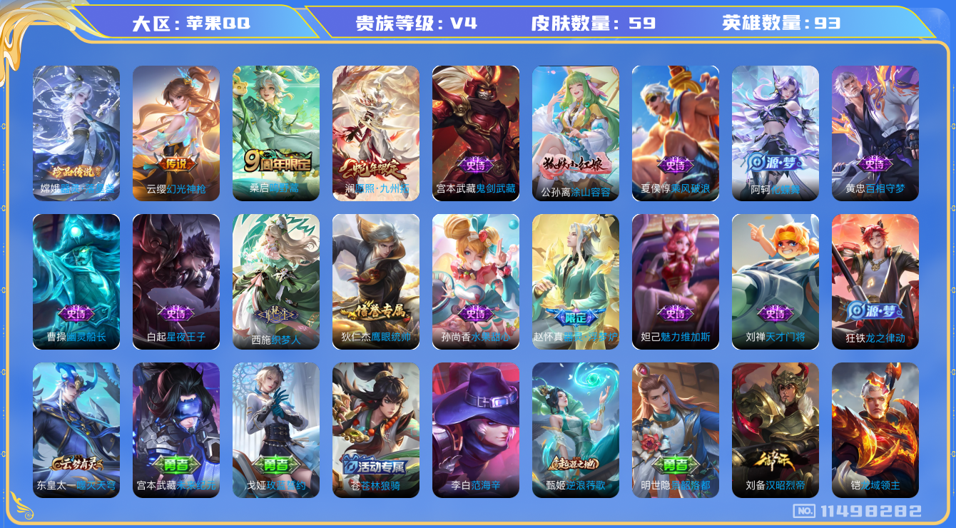 [11498282]V4 1珍品传说 3传说 93英雄 59皮肤 可修改实名 优质装备:器灵·落星盏,涂山容容 传说皮:幻光神枪 限定皮:愿照·九州拓(澜年限),鸣野蒿 史诗皮:器灵·浮梦炉,化蝶舞,龙之律动,百相守梦-黄忠,织梦人,水果甜心,天才门将,星夜王子,幽灵船长,鬼剑武藏,乘风破浪,鹰眼统帅,魅力维加斯