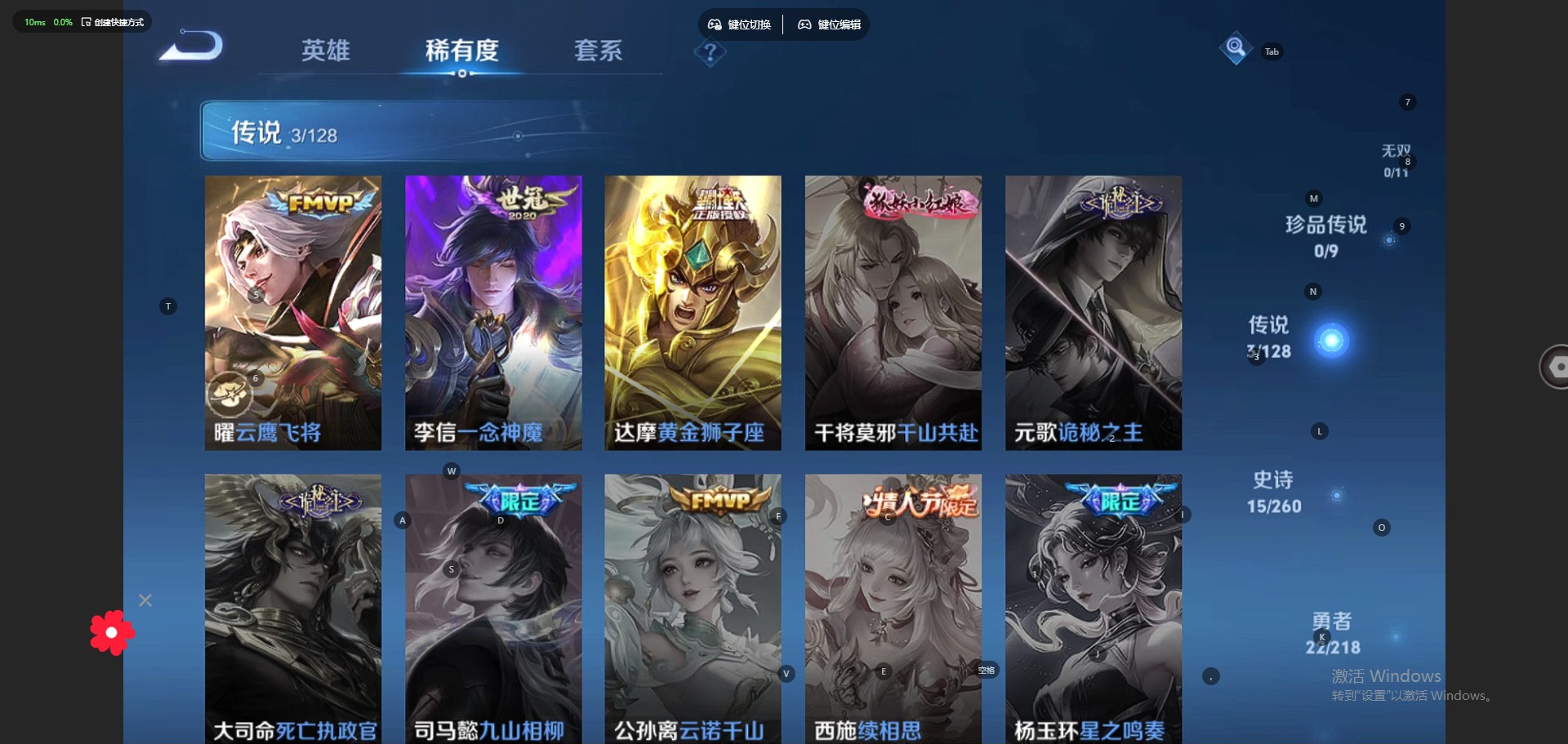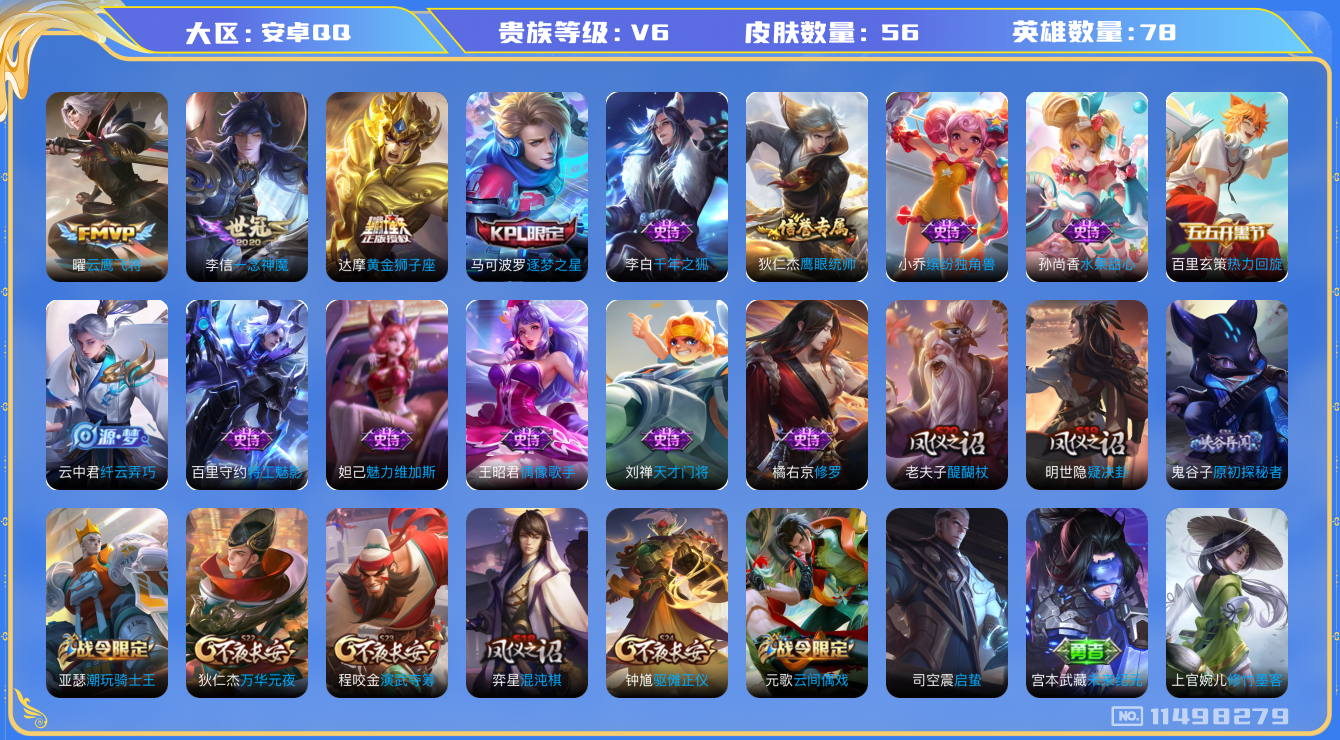 [11498279]V6 3传说 78英雄 56皮肤 可修改实名 优质装备:黄金狮子座,云鹰飞将(小将军),一念神魔 限定皮:逐梦之星 史诗皮:特工魅影,千年之狐,偶像歌手,修罗,水果甜心,天才门将,纤云弄巧,缤纷独角兽,热力回旋,鹰眼统帅,魅力维加斯