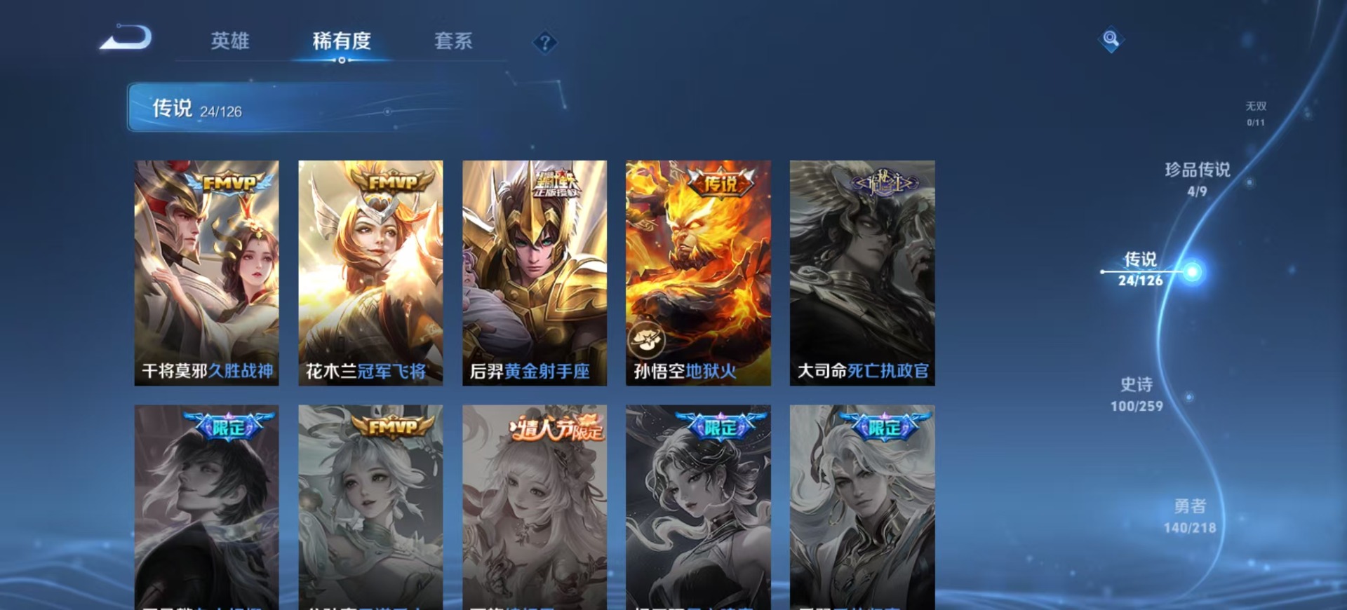 - PX_2074679-Q/至尊星耀/350皮肤/124英雄/2典藏/0珍品无双/0无双/2珍品传说/39传说/105史诗/9稀有英雄 【2 珍品传说】酷洛米之心 安琪拉,大耳狗之梦 瑶, 【2 典藏皮肤】鸣剑·曳影 李白,拾光映像 瑶, 【39 传说皮肤】胖达荣荣 梦奇,鹤归松栖 云缨,永恒水手月亮 王昭君,启明星使 虞姬,云鹰飞将 曜,夜礼服假面 狄仁杰,游龙清影 西施,灼幽烈阳 东皇太一,仲夏