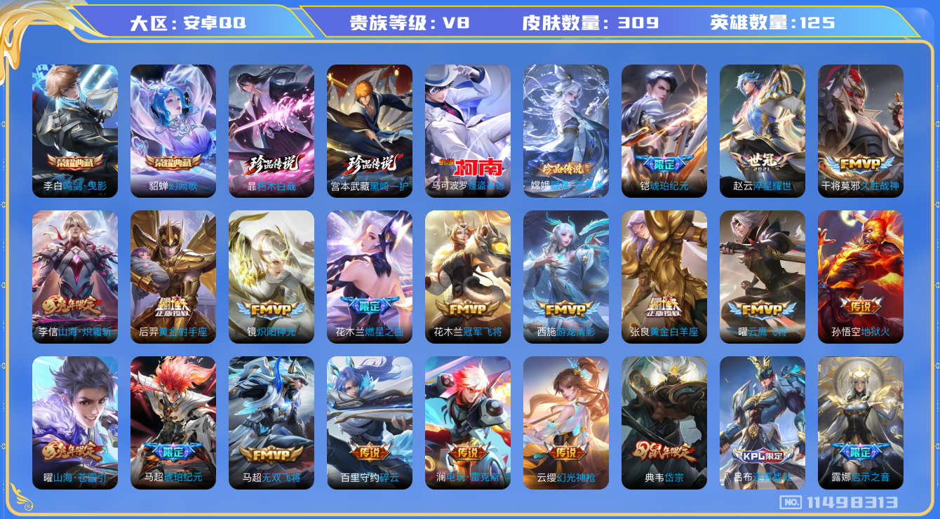 [11498313]V8 2典藏 4珍品传说 24传说 125英雄 309皮肤 可修改实名 优质装备:鸣剑·曳影,幻阙歌(貂蝉典藏),怪盗基德,器灵·落星盏,朽木白哉,黑崎一护,黄金射手座,冠军飞将,云鹰飞将(小将军),黄金白羊座,久胜战神,炽阳神光,地狱火,游龙清影(小青龙),淬星耀世,无双飞将,碎云,山海·炽霜斩(李信年限),山海·苍雷引(电光曜子),燃星之曲,电玩·雷克斯,琥珀纪元铠,琥珀纪元马超 传说皮:幻光神枪 珍宝阁皮:妄想食味,女武神 限定皮:愿照·千秋盛(女娲年限),逐霄战戟,陌上桑,鸣野蒿,神威(电光马子),高山流水,齐天大圣,五谷丰年,梁祝,岱宗(典韦年限),启示之音,枫霜尽,山海·玄木吟(马可年限) 史诗皮:鸭鸭历险记-刘禅,器灵·浮梦炉,化蝶舞,星界战将,龙之律动,石田雨龙,百相守梦-周瑜,茶境仙,海诺心动手记,破空之剑,战舞者,涂山红红,东方月初,蒙犽顽岩魄,埋骨钱,芈月浮光幕影,怒海争锋,谪仙醉月,上官婉儿群星魔术团,蔬乡物语(鲁班七号),琥珀纪元伽罗,百相守梦-百里守约,炽弈燎原,紫霞仙子,苍穹之光,电玩小子(小书包),黄金分割率,特工魅影,千年之狐,永昼,匿光破解者,江河有灵,雪夜绮愿(周瑜),百解令(蒙犽),高渐离燃音魔法,蒙恬荣光圣徽,偶像歌手,龙骑士(小龙虾),白蛇,暗夜猫娘,无限星赏官,晚萤,青蛇,末日机甲-吕布,猫狗日记-孙策,猫狗日记-大乔,节奏热浪,修罗,女仆咖啡,摇滚巨星,水果甜心,天才门将,星夜王子,心灵骇客,功夫厨神,德古拉伯爵,暗隐猎兽者,幽灵船长,鬼剑武藏,心灵战警,乐园奇幻夜,舞动绿茵,纤云弄巧,拒霜思,缤纷独角兽,乘风破浪,逐浪之夏,龙鼓争鸣,水晶猎龙者,曙光守护者,箭羽风息,金属风暴,原初追逐者,圣诞狂欢,圣诞恋歌,鹰眼统帅,暗夜贵公子,魅力维加斯,黎明之约,无心