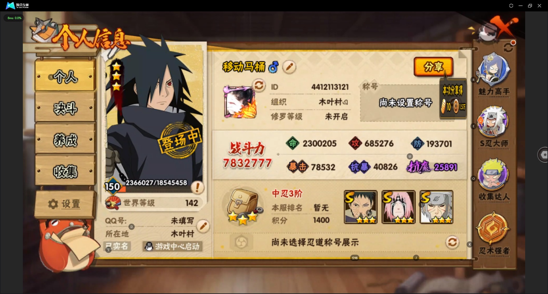 [11498380]V10 20S忍 27A忍 17通灵 783.2W战力 可二次 可修改实名 优质装备:宇智波鼬「秽土转生」,宇智波斑「秽土转生」,宇智波斑 「木叶创立」,千手扉间「秽土转生」,纲手「百豪」,千手柱间,迈特凯「死门」,宇智波带土 「忍界大战」,“宇智波斑” 「白面具」,漩涡鸣人 「九喇嘛连结」,春野樱 「忍界大战」,神秘面具男 「红夜之刃」,宇智波佐助「永恒万花筒」,宇智波斑「秽土转生·解」,艾「忍界大战」 S级忍者:自来也 「舞之豪杰」,佩恩「天道」,波风水门,大蛇丸,自来也
