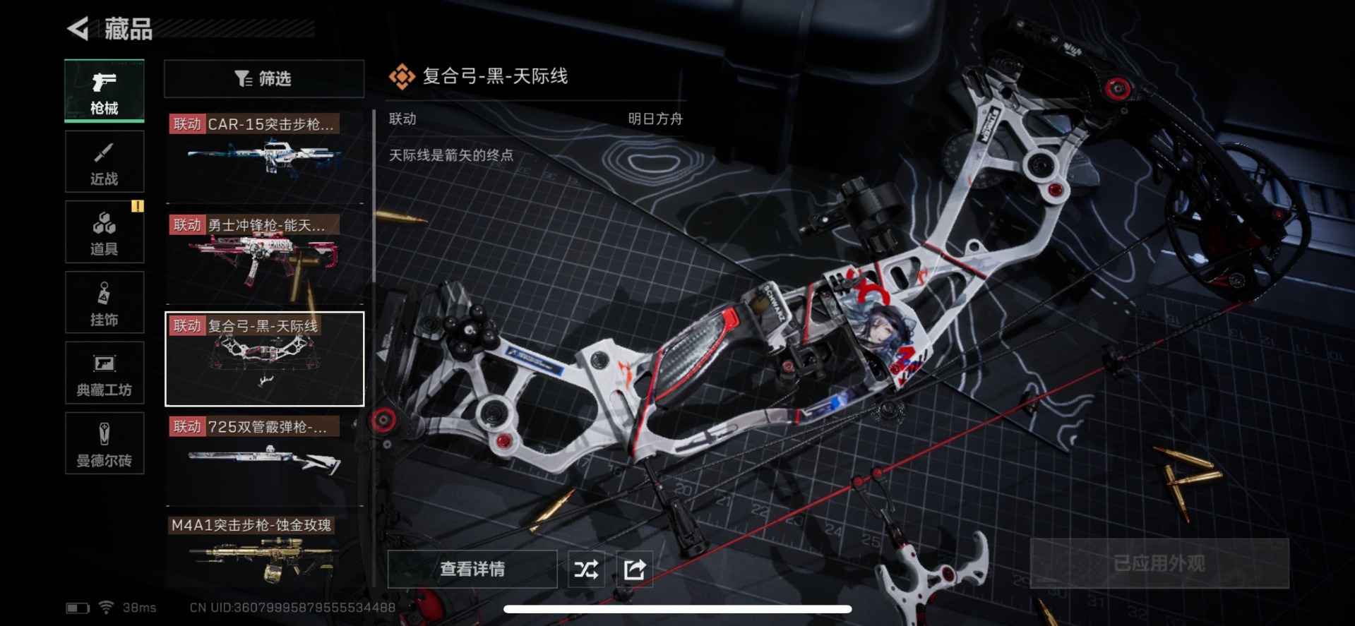 - [11517866]总资产:117.7 1干员外观 1传说枪械 进阶安全箱(2×2)9.15号到期 可二次 可修改实名 烽火地带段位:铂金 全面战场段位:列兵 哈夫币:8.530 传说武器皮肤:复合弓-黑-天际线 史诗武器皮肤:勇士冲锋枪-深海恐惧,AKM突击步枪-林中猎手,M16A4突击步枪-竞赛选手,M1014霰弹枪-林中猎手,SV-98狙击步枪-林中猎手,PTR-32突击步枪-英雄,SV-98狙击步枪-囚徒 干员外观:露娜-黑·天际线