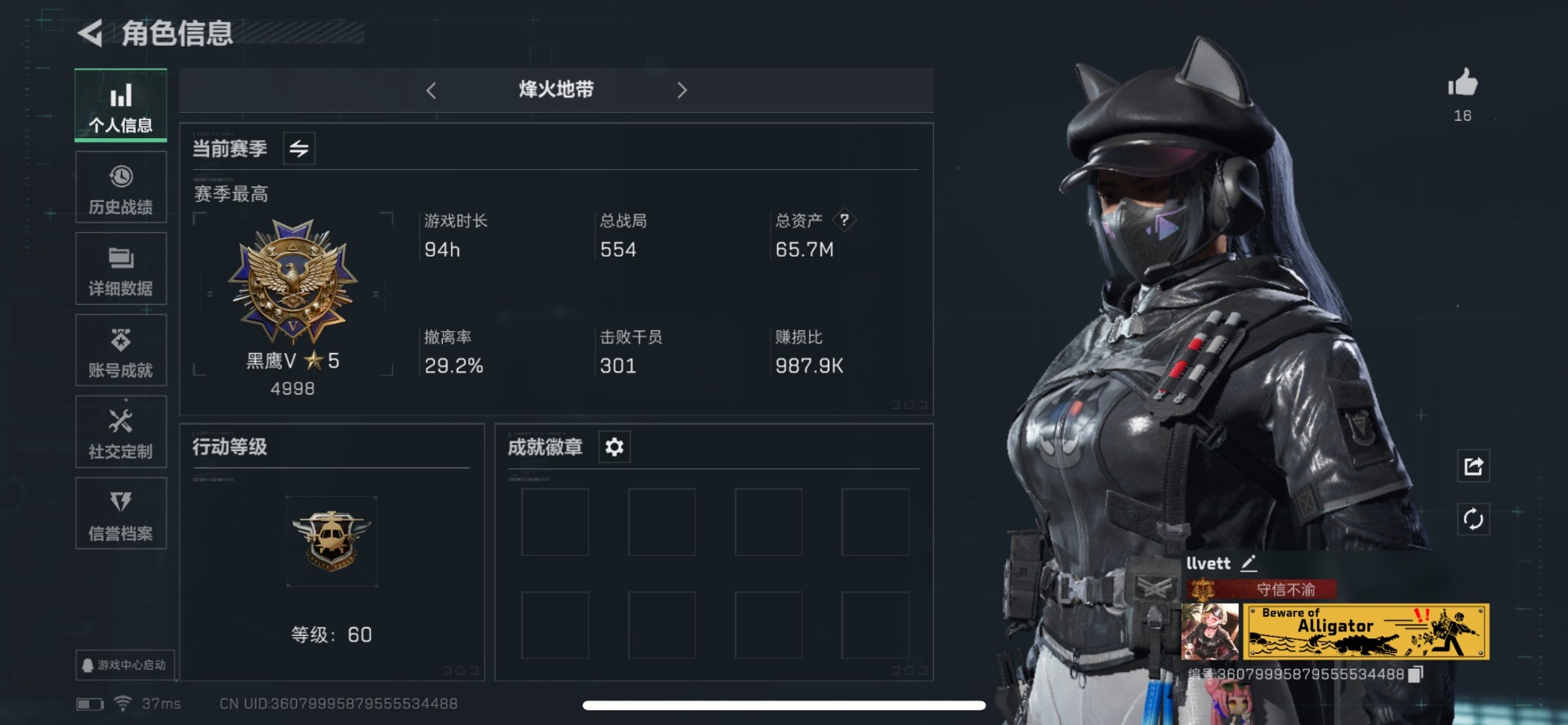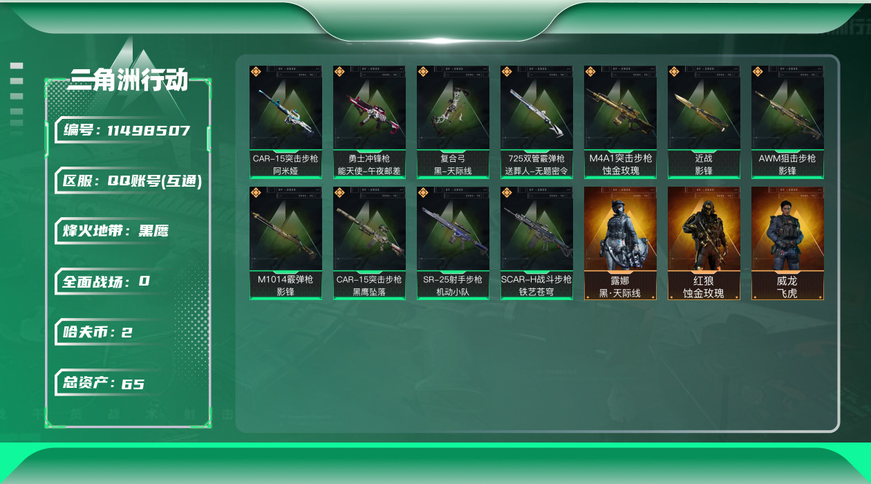 [11498507]总资产:65.7M 3干员外观 1近战传说 11传说枪械 哈夫币:2.684K 高级安全箱(9.17到期) 可二次 可修改实名 优质装备:近战-影锋 烽火地带段位:黑鹰 全面战场段位:军士长 传说武器皮肤:M1014霰弹枪-影锋,AWM狙击步枪-影锋,SCAR-H战斗步枪-铁艺苍穹,勇士冲锋枪-能天使-午夜邮差,复合弓-黑-天际线,725双管霰弹枪-送葬人-无题密令,CAR-15突击步枪-阿米娅,M4A1突击步枪-蚀金玫瑰,M7战斗步枪-机动小队,CAR-15突击步枪-黑鹰坠落 干员外观:红狼-蚀金玫瑰,威龙-飞虎,露娜-黑·天际线