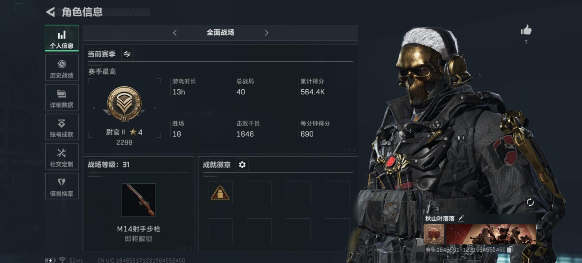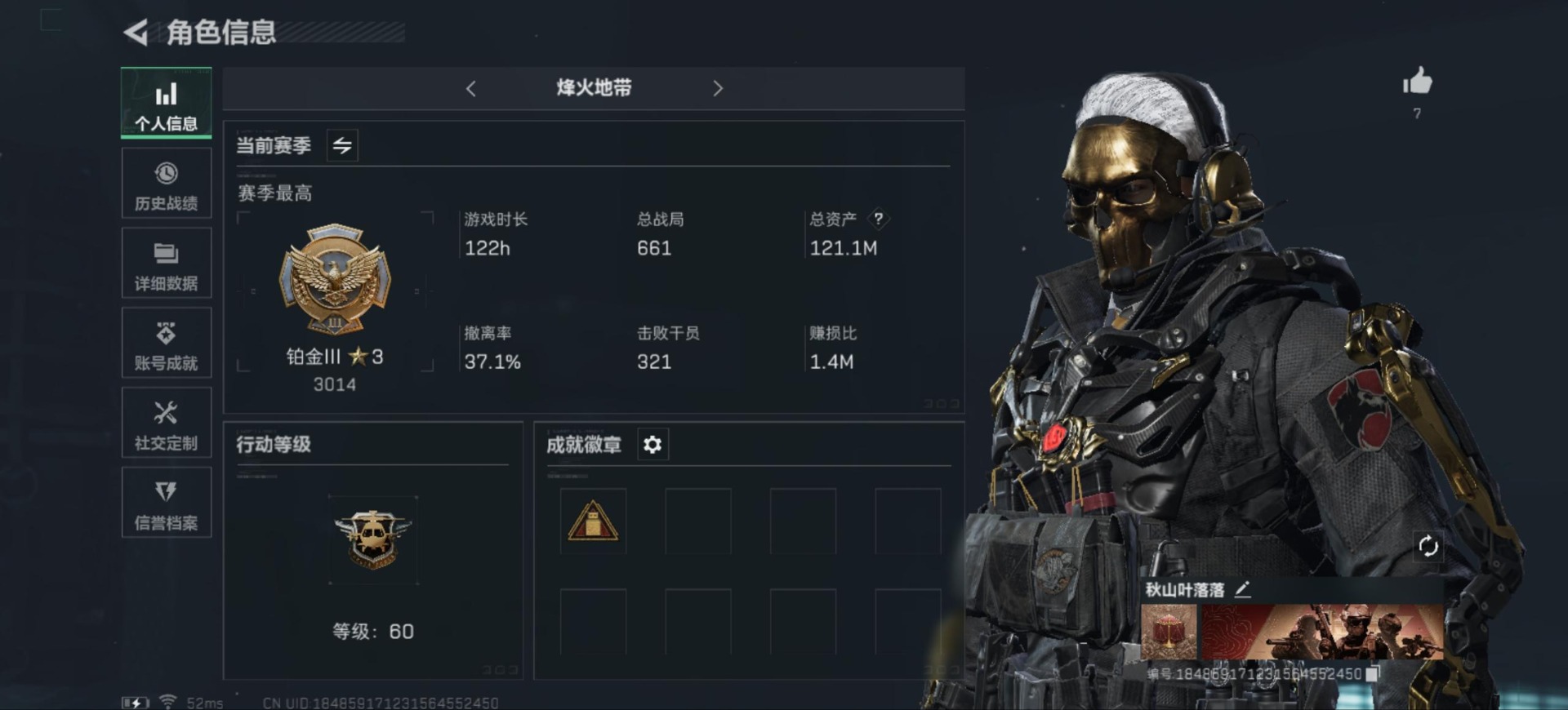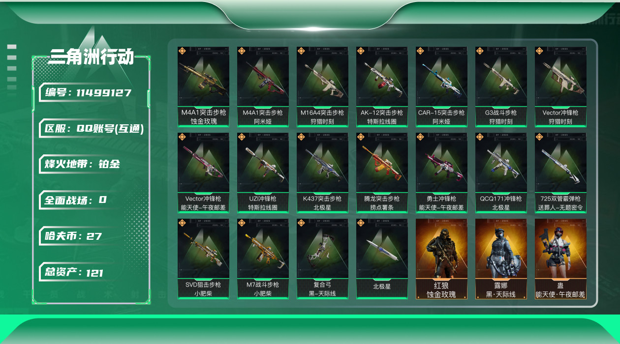 [11499127]总资产:121.1M 3干员外观 1近战传说 18传说枪械 哈夫币:27.622K 高级安全箱(9.17到期) 可二次 可修改实名 优质装备:近战-北极星 烽火地带段位:铂金 全面战场段位:尉官 传说武器皮肤:UZI冲锋枪-特斯拉线圈,M16A4突击步枪-狩猎时刻,腾龙突击步枪-捞点薯条,AK-12突击步枪-特斯拉线圈,勇士冲锋枪-能天使-午夜邮差,Vector冲锋枪-狩猎时刻,Vector冲锋枪-能天使-午夜邮差,M7战斗步枪-小肥柴,SVD狙击步枪-小肥柴,G3战斗步枪-狩猎时刻,复合弓-黑-天际线,K437突击步枪-北极星,QCQ171冲锋枪-北极星,725双管霰弹枪-送葬人-无题密令,M4A1突击步枪-阿米娅,CAR-15突击步枪-阿米娅,M4A1突击步枪-蚀金玫瑰 干员外观:红狼-蚀金玫瑰,露娜-黑·天际线,蛊-能天使·午夜邮差