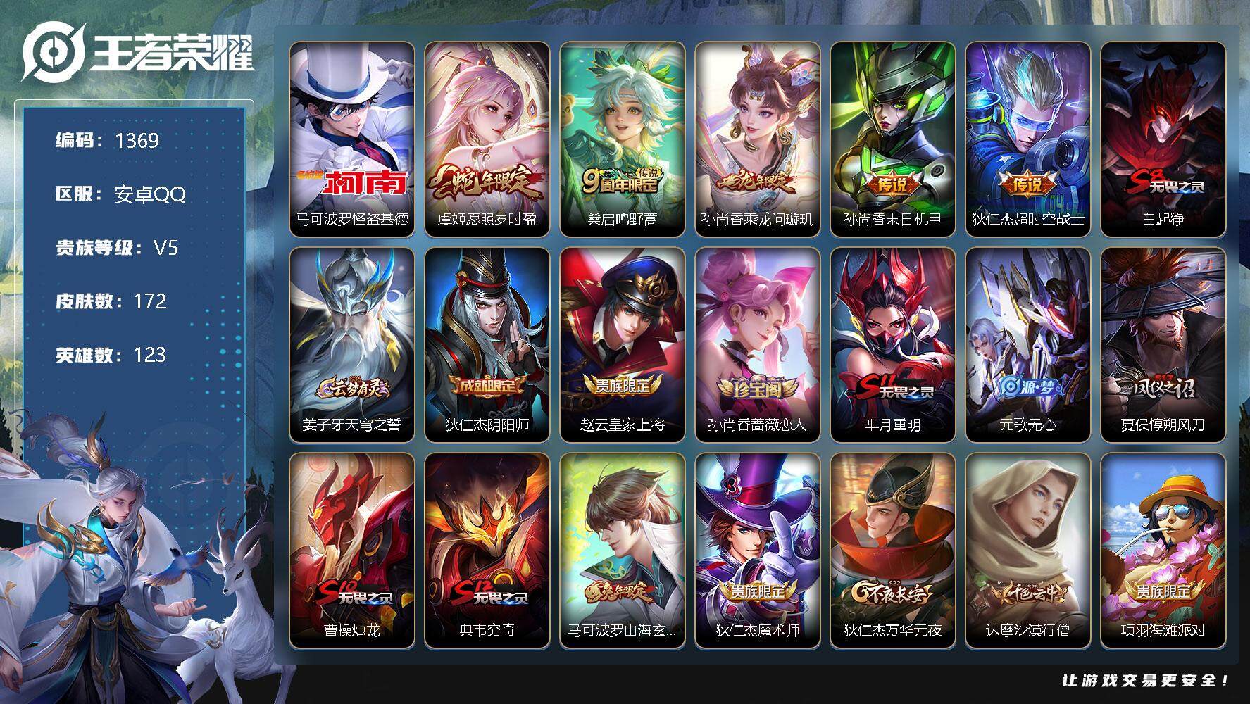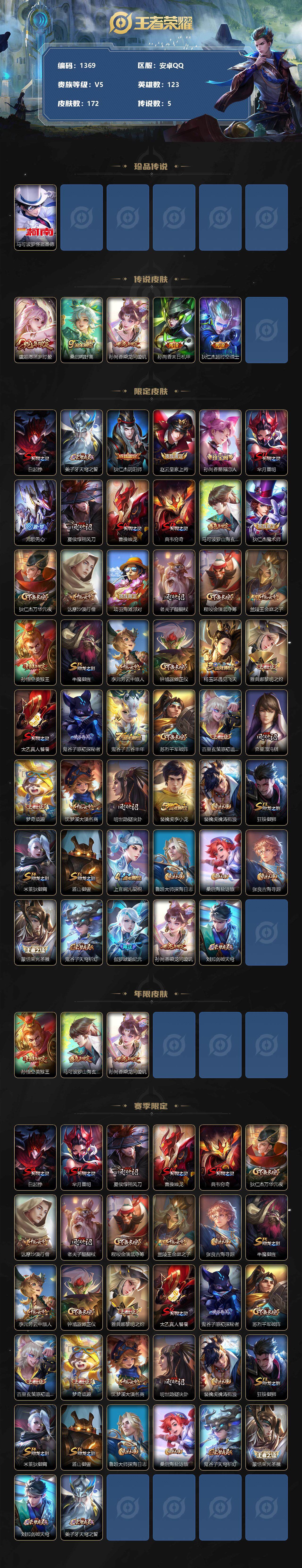 [11501536]【商品标题】:安卓Q-V5-最强王者段位-123英雄-172皮肤-0典藏-0珍品无双-0无双-1珍品传说-5传说-35史诗