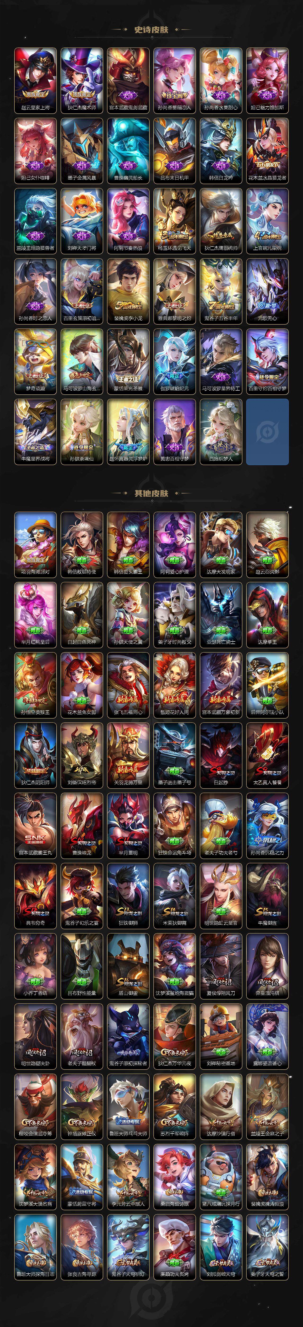 【史诗皮肤】:赵云皇家上将,狄仁杰魔术师,宫本武藏鬼剑武藏,孙尚香蔷薇恋人,孙尚香水果甜心,妲己魅力维加斯,妲己女仆咖啡,墨子金属风暴,曹操幽灵船长,吕布末日机甲,韩信白龙吟,花木兰水晶猎龙者,兰陵王暗隐猎兽者,刘禅天才门将,阿轲节奏热浪,杨玉环遇见飞天,狄仁杰鹰眼统帅,上官婉儿梁祝,孙尚香时之恋人,百里玄策原初追逐者,裴擒虎李小龙,雅典娜黎明之约,鬼谷子五谷丰年,元歌无心,梦奇顽趣,马可波罗山海玄木吟,蒙恬荣光圣徽,伽罗琥珀纪元,马可波罗星界特工,百里守约百相守梦,牛魔星界战将,孙膑茶境仙,赵怀真器灵浮梦炉,黄忠百相守梦,西施