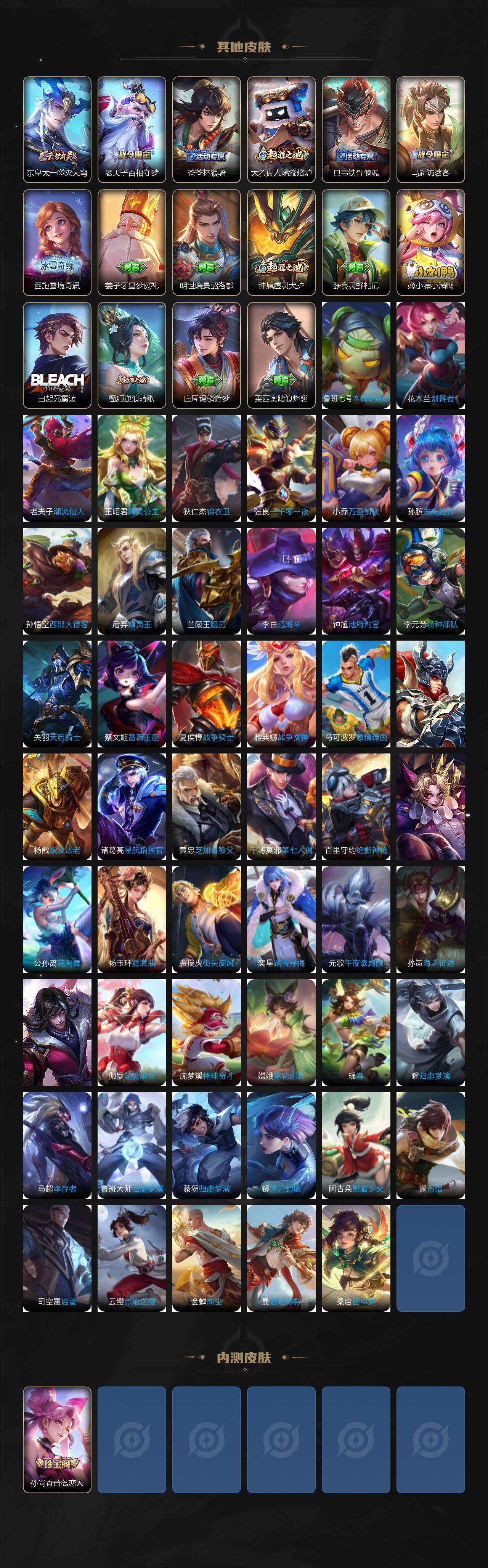 【限定皮肤】:白起狰,姜子牙天穹之誓,狄仁杰阴阳师,赵云皇家上将,孙尚香蔷薇恋人,芈月重明,元歌无心,夏侯惇朔风刀,曹操烛龙,典韦穷奇,马可波罗山海玄木吟,狄仁杰魔术师,狄仁杰万华元夜,达摩沙漠行僧,项羽海滩派对,老夫子醍醐杖,程咬金演武夺筹,兰陵王金庭之子,孙悟空美猴王,牛魔御旌,李元芳云中旅人,钟馗驱傩正仪,杨玉环遇见飞天,雅典娜黎明之约,太乙真人饕餮,鬼谷子原初探秘者,鬼谷子五谷丰年,苏烈千军破阵,百里玄策原初追逐者,弈星混沌棋,梦奇顽趣,沈梦溪大漠名商,明世隐疑决卦,裴擒虎李小龙,裴擒虎擒涛扼浪,狂铁御狮,米莱狄御霄,盾山御銮,上官婉儿梁祝,鲁班大师探海日志,桑启海盐诗旅,张良古海寻踪,蒙恬荣光圣徽,鬼谷子天穹祈灯,伽罗琥珀纪元,孙尚香乘龙问璇玑,刘邦剑破天穹