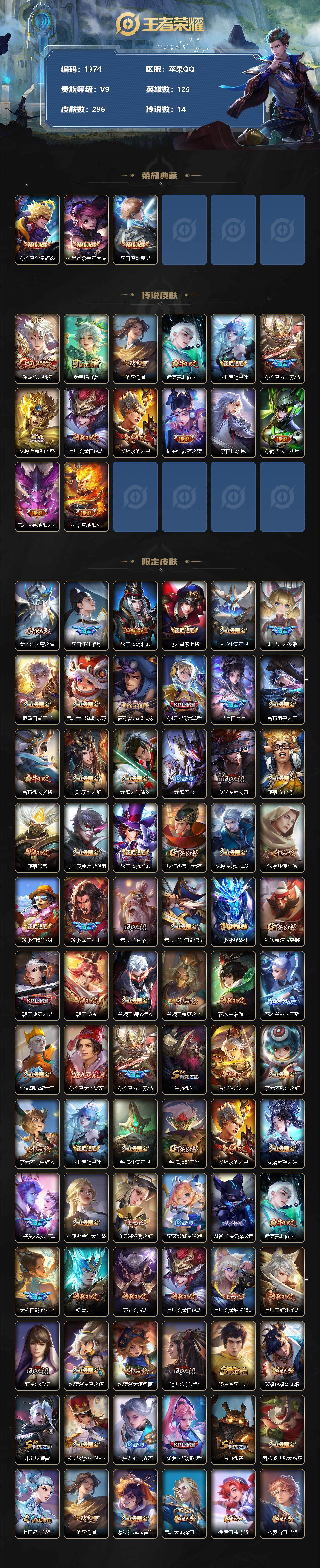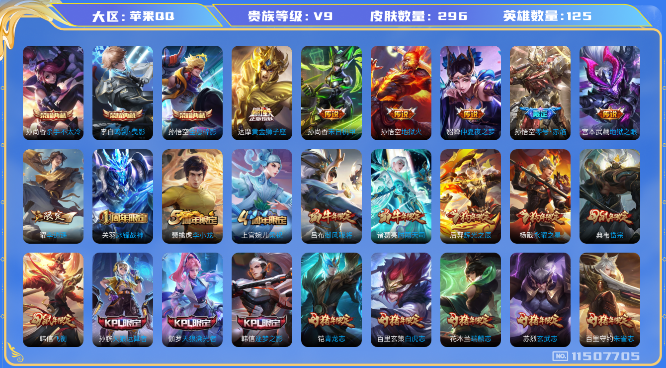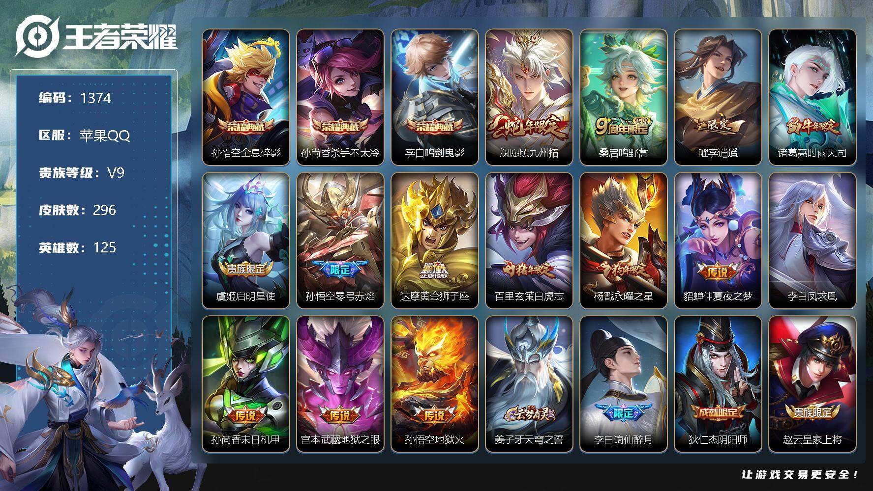 [11507705]【商品标题】:苹果Q-V9-最强王者段位-125英雄-296皮肤-3典藏-0珍品无双-0无双-0珍品传说-14传说-89史诗