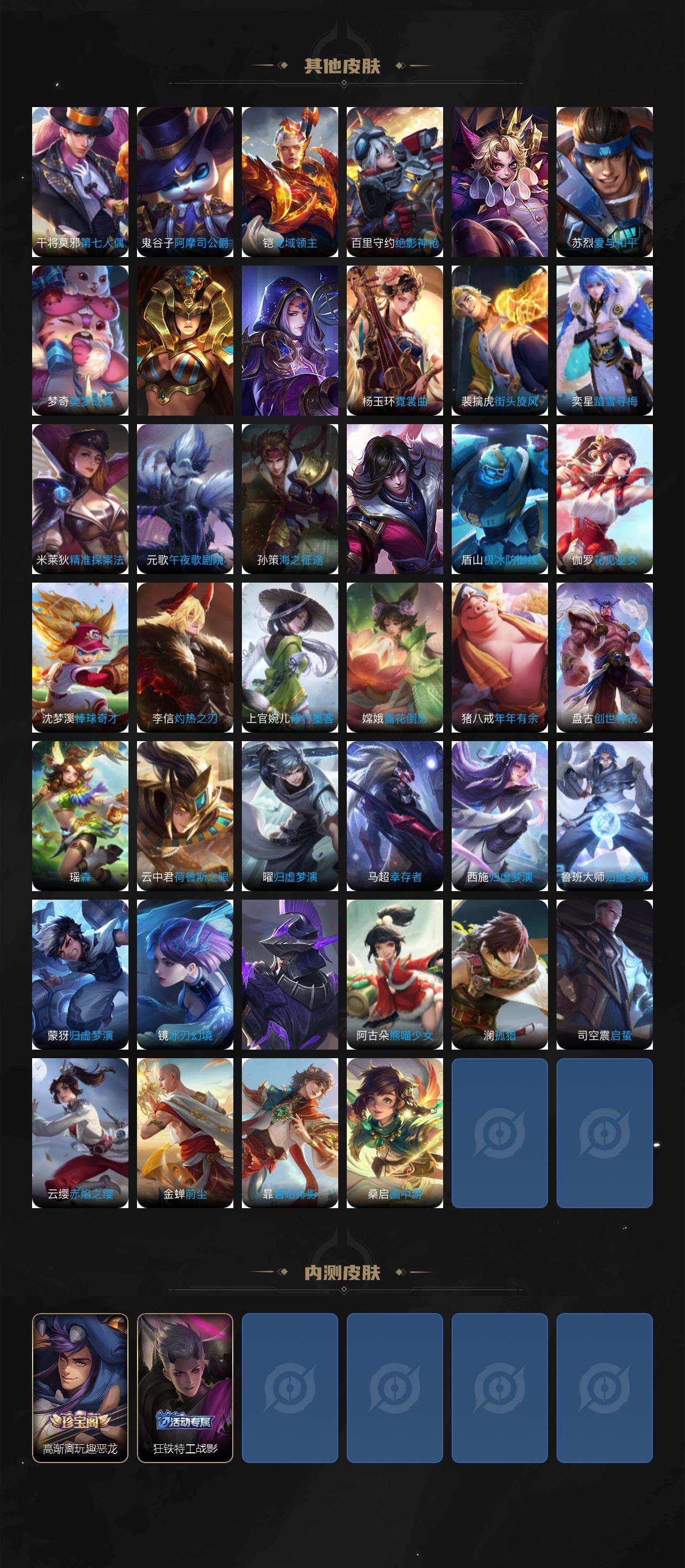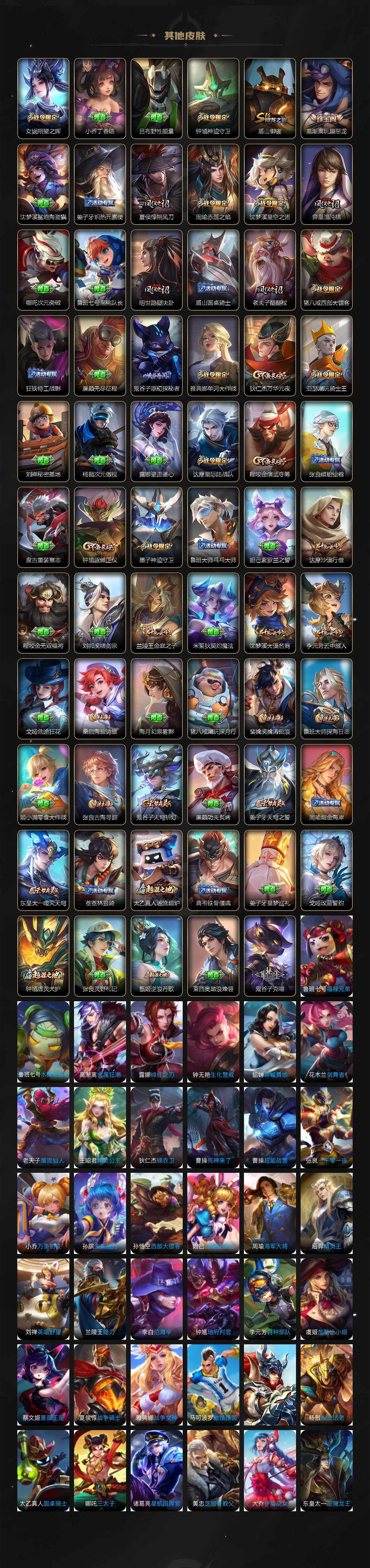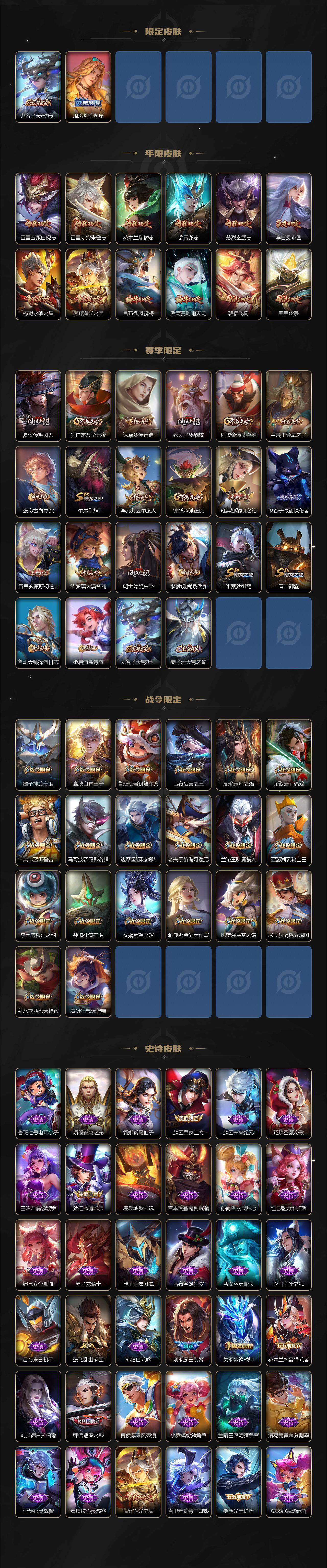 【限定皮肤】:姜子牙天穹之誓,李白谪仙醉月,狄仁杰阴阳师,赵云皇家上将,墨子神迹守卫,妲己时之彼端,嬴政白昼王子,鲁班七号狮舞东方,高渐离玩趣恶龙,孙膑天狼运算者,芈月白晶晶,吕布猎兽之王,吕布御风骁将,周瑜赤莲之焰,元歌云间偶戏,元歌无心,夏侯惇朔风刀,典韦蓝屏警告,典韦岱宗,马可波罗暗影游猎,狄仁杰魔术师,狄仁杰万华元夜,达摩星际陆战队,达摩沙漠行僧,项羽海滩派对,项羽霸王别姬,老夫子醍醐杖,老夫子航海奇遇记,关羽冰锋战神,程咬金演武夺筹,韩信逐梦之影,韩信飞衡,兰陵王驯魔猎人,兰陵王金庭之子,花木兰瑞麟志,花木兰默契交锋,亚瑟潮玩骑士王,孙悟空大圣娶亲,孙悟空零号赤焰,牛魔御旌,后羿辉光之辰,李元芳银河之约,李元芳云中旅人,虞姬启明星使,钟馗神迹守卫,钟馗驱傩正仪,杨戬永曜之星,女娲朔望之晖,干将莫邪冰霜恋舞曲,雅典娜单词大作战,雅典娜黎明之约,蔡文姬繁星吟游,鬼谷子原初探秘者,诸葛亮时雨天司,大乔白鹤梁神女,铠青龙志,苏烈玄武志,百里玄策白虎志,百里玄策原初追逐者,百里守约朱雀志,弈星混沌棋,沈梦溪星空之诺,沈梦溪大漠名商,明世隐疑决卦,裴擒虎李小龙,裴擒虎擒涛扼浪,米莱狄御霄,米莱狄胡桃异想国,云中君纤云弄巧,伽罗天狼溯光者,盾山御銮,猪八戒西部大镖客,上官婉儿梁祝,曜李逍遥 ,蒙犽狂想玩偶喵,鲁班大师探海日志,桑启海盐诗旅,张良古海寻踪,鬼谷子天穹祈灯,周瑜熔金海岸