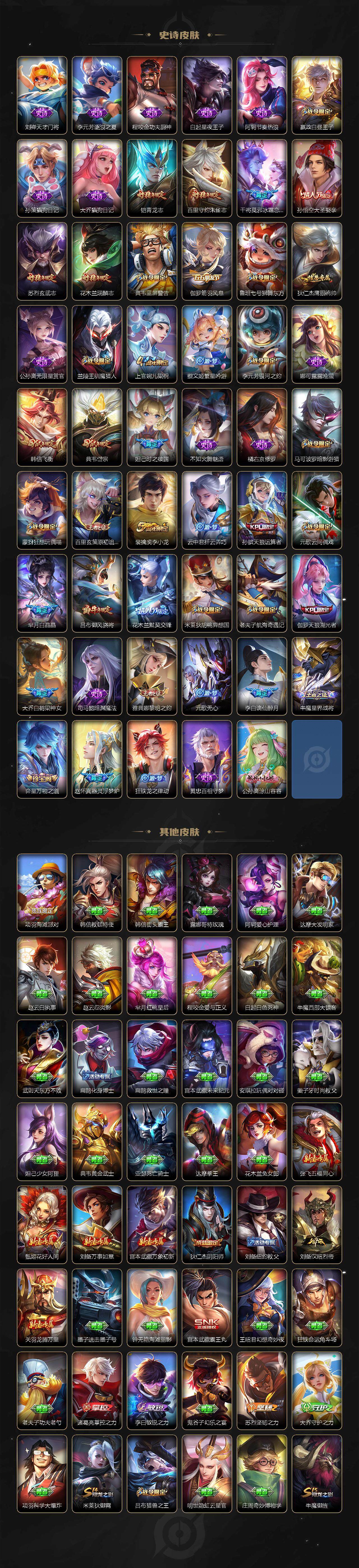 关羽冰锋战神,裴擒虎李小龙,上官婉儿梁祝,吕布御风骁将,诸葛亮时雨天司,后羿辉光之辰,典韦岱宗,韩信飞衡,孙膑天狼运算者,伽罗天狼溯光者,韩信逐梦之影,铠青龙志,百里玄策白虎志,花木兰瑞麟志,苏烈玄武志,百里守约朱雀志,项羽霸王别姬,孙悟空大圣娶亲,花木兰默契交锋,干将莫邪冰霜恋舞曲,妲己时之彼端,芈月白晶晶,大乔白鹤梁神女,桑启鸣野蒿,澜愿照·九州拓