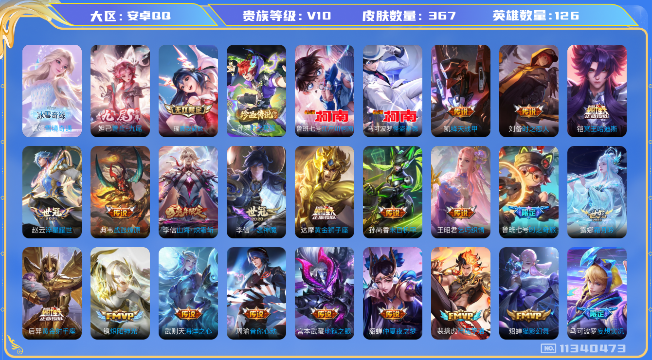 [11340473]V10 3无双 3珍品传说 43传说 126英雄 367皮肤 典藏英雄武则天 可修改实名 优质装备:真我赫兹(瑶)(瑶无双),青丘·九尾(妲己无双),雪境奇遇-甄姬,江户川柯南,怪盗基德,黄金狮子座,黄金射手座,云鹰飞将(小将军),绛天战甲(鸡嘴战神),黄金白羊座,猫影幻舞,炽阳神光,一念神魔,云霓雀翎,末日机甲-孙尚香(绿蚂蚱),地狱火,仲夏夜之梦(大飞蛾),零号·赤焰,海洋之心,地狱之眼,音你心动-周瑜,胖达荣荣,乞巧织情,时之恋人-刘备(电焊工),淬星耀世,超时空战士-狄仁杰,无双飞将,山海·炽霜斩(李信年限),青丘·九尾,妄想实况,鲁班七号-时之奇旅,霜月吟,澜逐花归海,艾琳觅芳踪,玄雷天君 珍品传说:时之奇旅-孙策 传说皮:典韦战鼓燎原,铠冥王哈迪斯,祥瑞亨通 珍宝阁皮:蔷薇恋人 限定皮:愿照·福禄聚(蔡文姬年限),愿照·岁时盈(虞姬年限),愿照·众生和(妲己年限),愿照·千秋盛(女娲年限),陌上桑,鸣野蒿,夏侯惇霜北刀,至尊宝,凤凰于飞,梅西,武陵仙君(小桃花),时之彼端,魔法小厨娘,神威(电光马子),齐天大圣,降魔,青龙志(铠年限),冰锋战神,游园惊梦,梁祝,天狼狩猎者,龙胆,逐梦之翼,逐梦之星,烈魂,逐梦之音,天狼征服者,李小龙,逐梦之影,玄武志(苏烈年限),永曜之星,辉光之辰,霸王别姬-虞姬,引擎之心,天魔缭乱,青春决赛季,云端筑梦师,热情桑巴,神奇女侠,美猴王,百木心枪,山海·玄木吟(马可年限) 史诗皮:飞车小橘子,苍鳞隐世,谪仙醉月,茶境仙,幻珠鲛人,怒海争锋,炽弈燎原,撼地雄心,破空之剑,涂山红红,东方月初,百相守梦-百里守约,星界特工,遇见神鹿,紫霞仙子,苍穹之光,电玩小子(小书包),白龙吟,黄金分割率,特工魅影,千年之狐,末日机甲-莱西奥,魅语,无限星赏官,冰冠公主,青蛇,龙骑士(小龙虾),末日机甲-吕布,猫狗日记-孙策,猫狗日记-大乔,时之恋人-孙尚香,乱世虎臣,节奏热浪,修罗,女仆咖啡,水果甜心,绅士熊喵,天才门将,星夜王子,心灵骇客,时之奇旅-安琪拉,功夫厨神,德古拉伯爵,暗隐猎兽者,幽灵船长,鬼剑武藏,心灵战警,乐园奇幻夜,天秀·启明,舞动绿茵,地狱岩魂,繁星吟游(呼啦呼啦),缤纷独角兽,乘风破浪,逐浪之夏,水晶猎龙者,曙光守护者,热力回旋,箭羽风息,唤灵魅影,金属风暴,原初追逐者,圣诞狂欢,圣诞恋歌,鹰眼统帅,暗夜贵公子,魅力