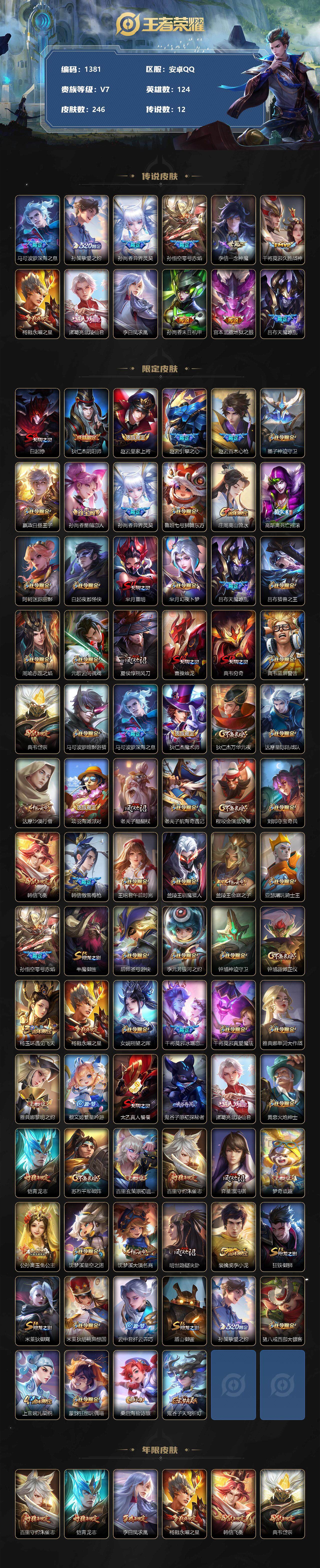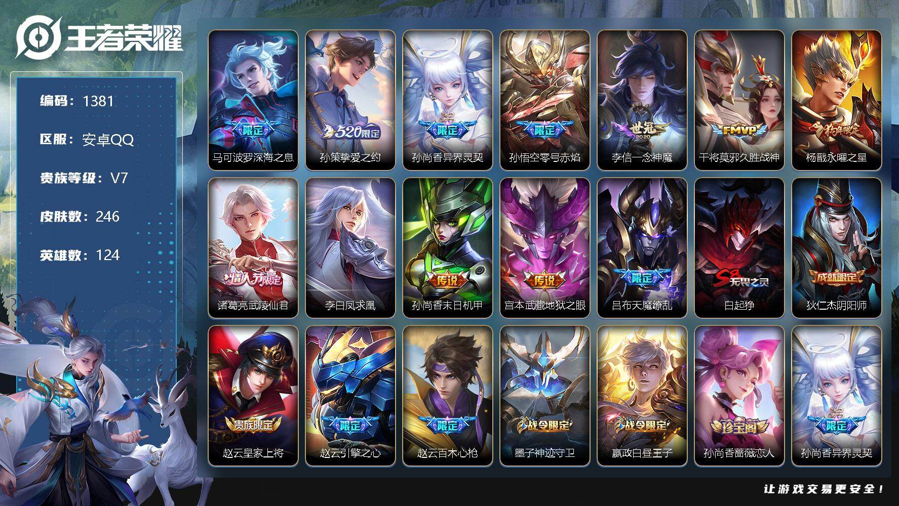 [11511429]【商品标题】:安卓Q-V6-最强王者段位-124英雄-246皮肤-0典藏-0珍品无双-0无双-0珍品传说-12传说-75史诗