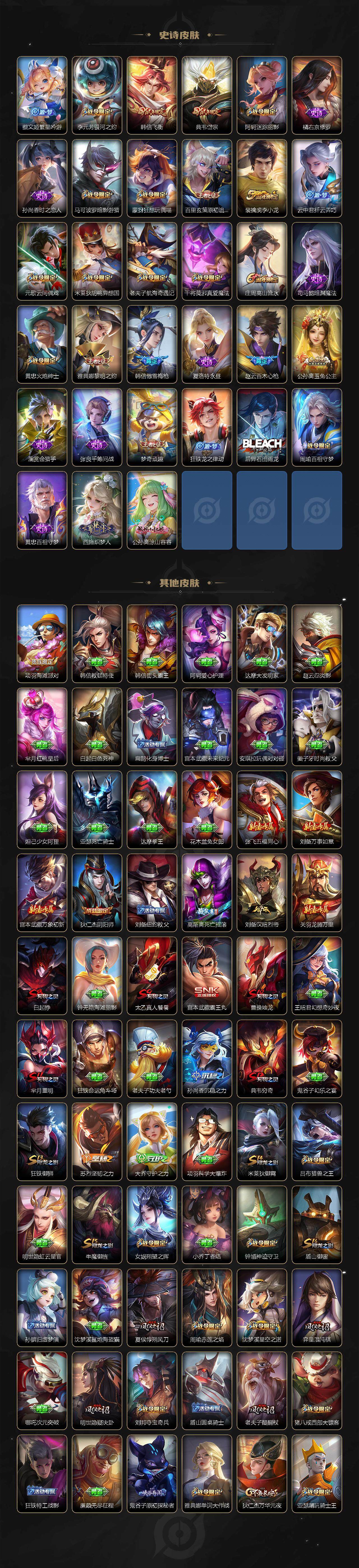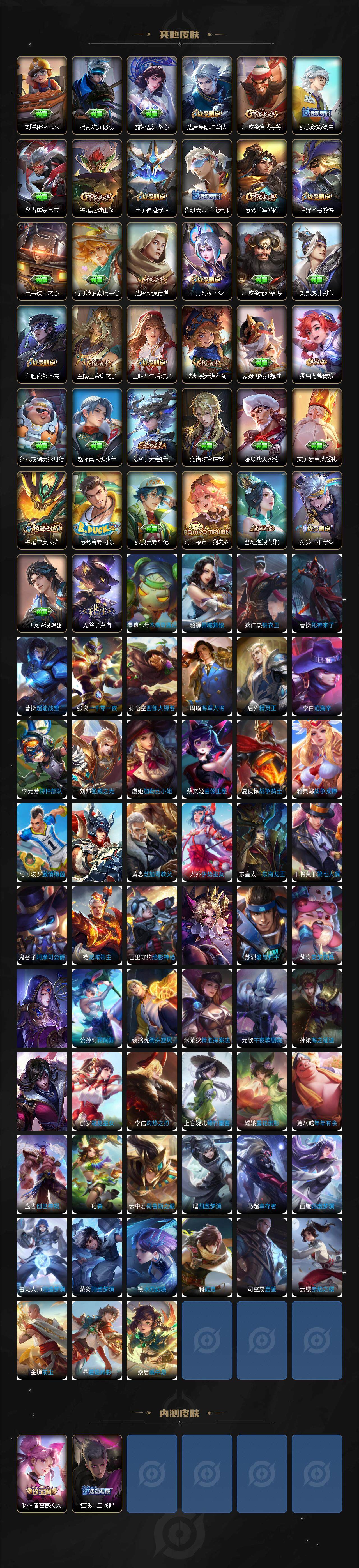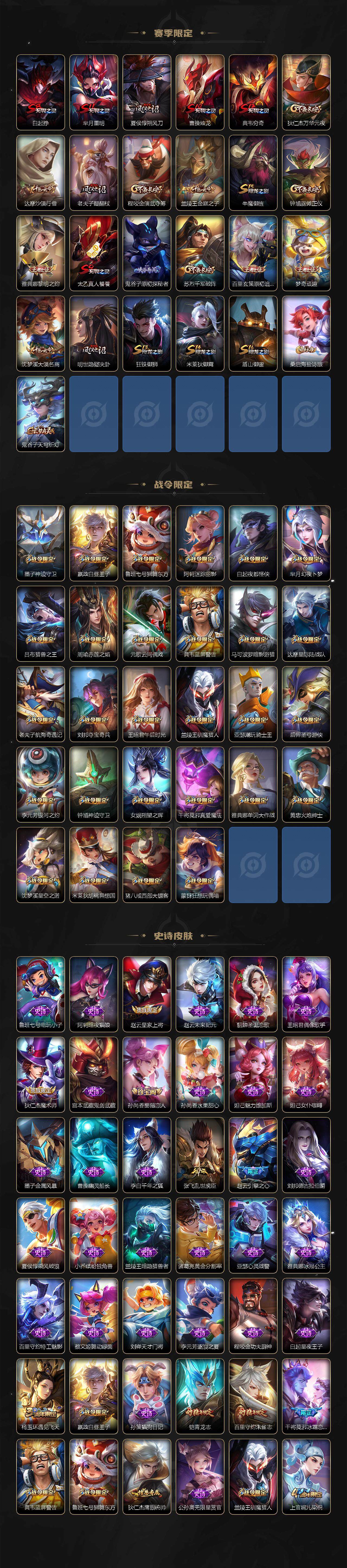 【限定皮肤】:白起狰,狄仁杰阴阳师,赵云皇家上将,赵云引擎之心,赵云百木心枪,墨子神迹守卫,嬴政白昼王子,孙尚香蔷薇恋人,孙尚香异界灵契,鲁班七号狮舞东方,庄周高山流水,高渐离死亡摇滚,阿轲迷踪丽影,白起夜都怪侠,芈月重明,芈月幻夜卜梦,吕布天魔缭乱,吕布猎兽之王,周瑜赤莲之焰,元歌云间偶戏,夏侯惇朔风刀,曹操烛龙,典韦穷奇,典韦蓝屏警告,典韦岱宗,马可波罗暗影游猎,马可波罗深海之息,狄仁杰魔术师,狄仁杰万华元夜,达摩星际陆战队,达摩沙漠行僧,项羽海滩派对,老夫子醍醐杖,老夫子航海奇遇记,程咬金演武夺筹,刘邦夺宝奇兵,韩信飞衡,韩信傲雪梅枪,王昭君午后时光,兰陵王驯魔猎人,兰陵王金庭之子,亚瑟潮玩骑士王,孙悟空零号赤焰,牛魔御旌,后羿圣弓游侠,李元芳银河之约,钟馗神迹守卫,钟馗驱傩正仪,杨玉环遇见飞天,杨戬永曜之星,女娲朔望之晖,干将莫邪冰霜恋舞曲,干将莫邪真爱魔法,雅典娜单词大作战,雅典娜黎明之约,蔡文姬繁星吟游,太乙真人饕餮,鬼谷子原初探秘者,诸葛亮武陵仙君,黄忠火炮绅士,铠青龙志,苏烈千军破阵,百里玄策原初追逐者,百里守约朱雀志,弈星混沌棋,梦奇顽趣,公孙离玉兔公主,沈梦溪星空之诺,沈梦溪大漠名商,明世隐疑决卦,裴擒虎李小龙,狂铁御狮,米莱狄御霄,米莱狄胡桃异想国,云中君纤云弄巧,盾山御銮,孙策挚爱之约,猪八戒西部大镖客,上官婉儿梁祝,蒙犽狂想玩偶喵,桑启海盐诗旅,鬼谷子天穹祈灯