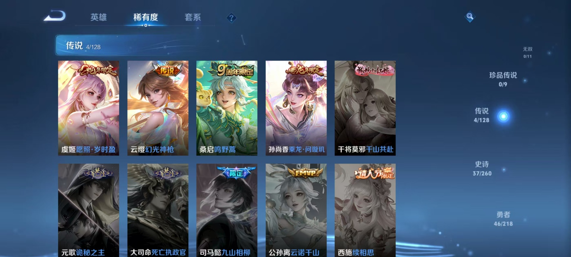 - [11824265]V6 3传说 112英雄 144皮肤 可修改实名 优质装备:地狱火 传说皮:云诺千山 珍宝阁皮:蔷薇恋人 限定皮:逐霄战戟,鸣野蒿,魔法小厨娘,高山流水,五谷丰年,游园惊梦,李小龙,逐梦之影,如梦令-后羿,孙行者,引擎之心,美猴王 史诗皮:赞萌露比,苍鳞隐世,化蝶舞,龙之律动,石田雨龙,琥珀纪元伽罗,百相守梦-黄忠,守夜人,江河有灵,雪夜绮愿(周瑜),百解令(蒙犽),冰冠公主,末日机甲-吕布,猫狗日记-大乔,时之恋人-孙尚香,乱世虎臣,水果甜心,星夜王子,心灵骇客,功夫厨神,暗隐猎兽者,纤云弄巧,拒霜思,缤纷独角兽,乘风破浪,逐浪之夏,曙光守护者,暗夜贵公子,魅力维加斯,无心