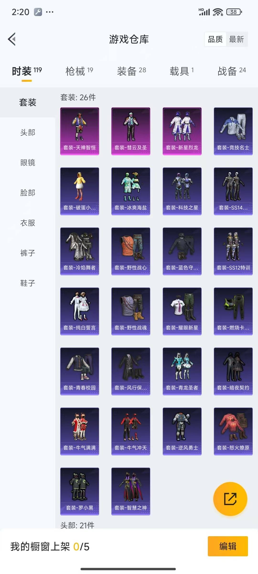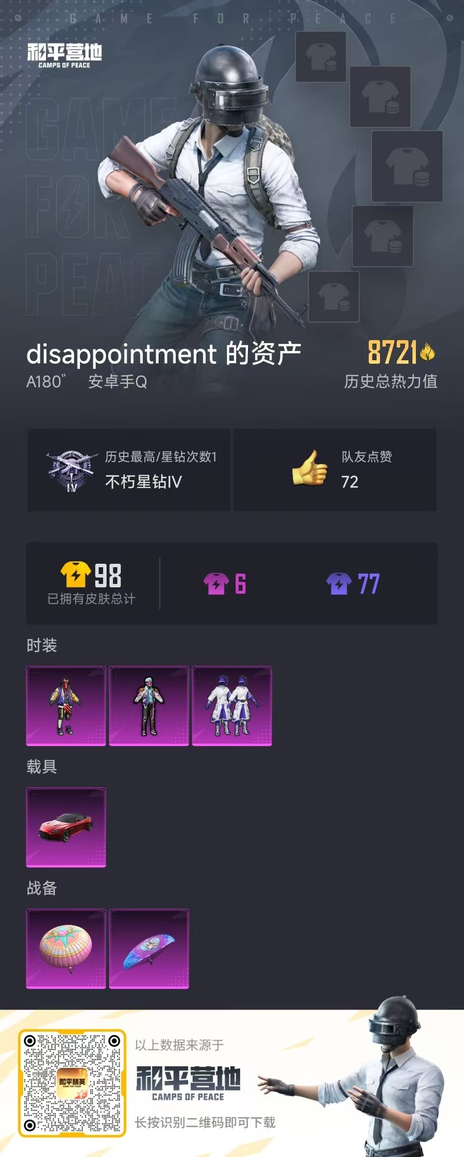 - [12204422]1粉装 5特效枪 1载具 8印记 可二次 可修改实名 优质装备:特斯拉Roadster(水滴蓝),苍蓝魅影,UMP45相思残雪(UMP45-相思残雪),AKM梦之光华,SCAR-L-锦绣绵绵,七级AKM-梦之光华,七级UMP45-相思残雪,Kar98K-巳巳如意 稀有枪皮:DP-28-豹影疾电 五级特效枪:五级Kar98K-巳巳如意,五级SCAR-L-锦绣绵绵 一级特效枪:一级DP-28-豹影疾电 紫色装扮:SS22特训,SS21特训,SS31特训套装,SS2特训,SS3特训,SS4特训,人气偶像,决胜时刻,冷焰舞者,刚毅裁决者,北国孤狼,SS30特训套装,SS33特训套装,SS20特训,青春冒险家,潮流游乐家,SS15特训,暗夜傀儡,SS16特训,银白舞王,SS13特训,星梦畅游,SS14特训,萌趣颜团子,特种颜团子,微雨春柳,暖风夏荷,飞驰魅影,音速流光,SS19特训,吉莉礼服,SS17特训,SS18特训,阳光火鸡,都市漫游者,都市魅力,酒红色名流,长空猛禽,霓虹街区,迎春赐吉,缤纷果语,耀眼新星,蓝彩潮人,蓝色守护者,蓝色运动,虎虎生威吉莉,街头潮人,飞行日记,魅力单车,鹤鸣,麻辣教官,黄色伏地魔,黄色名流,黄色运动,黑色伏地魔,龙的传人,龟仙人,冰河战士,龙魂突击队,蝶变,极速红龙,沙漠兵团,海岛探路者,海滨突袭者,深蓝色名流,幻影武者,坚韧舞者,夏日音浪,夜莺强袭者,完美偶像,帅气教官,幻世战舞者,怒火燎原,战地督导,战地菁英,湖蓝色名流,绮丽涂鸦,疯狂小兔子,白熊同盟,白色伏地魔,破晓战魂,破蛋小黄鸡,福星高照,空岛之星,空投萌叽,竞技勇士朋克,竞技达人朋克,红色运动,牛气冲天,灼焰舞者,炫蓝之夏,热血青春,燃烧卡路里,牛气满满,猛禽,镭射皇者,SS29特训,纯真浪花,热情海星,SS28特训,创世·追猎,鱼渊荷华,玉兔迎春,竞技名士,SS25特训,焰鹰斗篷,幻羽潜行,SS27特训,SS26特训,SS6特训,大橘大利,SS10特训,耀粉歌者,春日漫步,蓝冰羽,紫幽梦,SS32特训服(SS32特训套装),绯格组合,萌黄之夏,蜜桃派对,恋语绒绒,双彩圣灵 优质战备:星之彼岸降落伞,樱桃泡泡降落伞,飞行器-庄周梦蝶,四圣焕新降落伞,相思残雪降落伞,怪笑疯兔降落伞,洛神天依降落伞