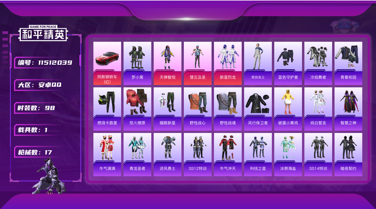 [11512039]3粉装 1载具 可二次 可修改实名 优质装备:阿斯顿·马丁DBS(红),彗云及圣,天禅智恒,新星烈龙(小白龙) 热门装扮:罗小黑 紫色装扮:冷焰舞者,冰爽海盐,科技之星,SS14特训,野性战心,野性战魂,青春校园,耀眼新星,蓝色守护者,风行保卫者,怒火燎原,破蛋小黄鸡,牛气冲天,燃烧卡路里,牛气满满,竞技名士,青龙圣者,逆风勇士,SS12特训,纯白誓言,智慧之神,暗夜契约 优质战备:深海曼妙降落伞,心之恋语降落伞