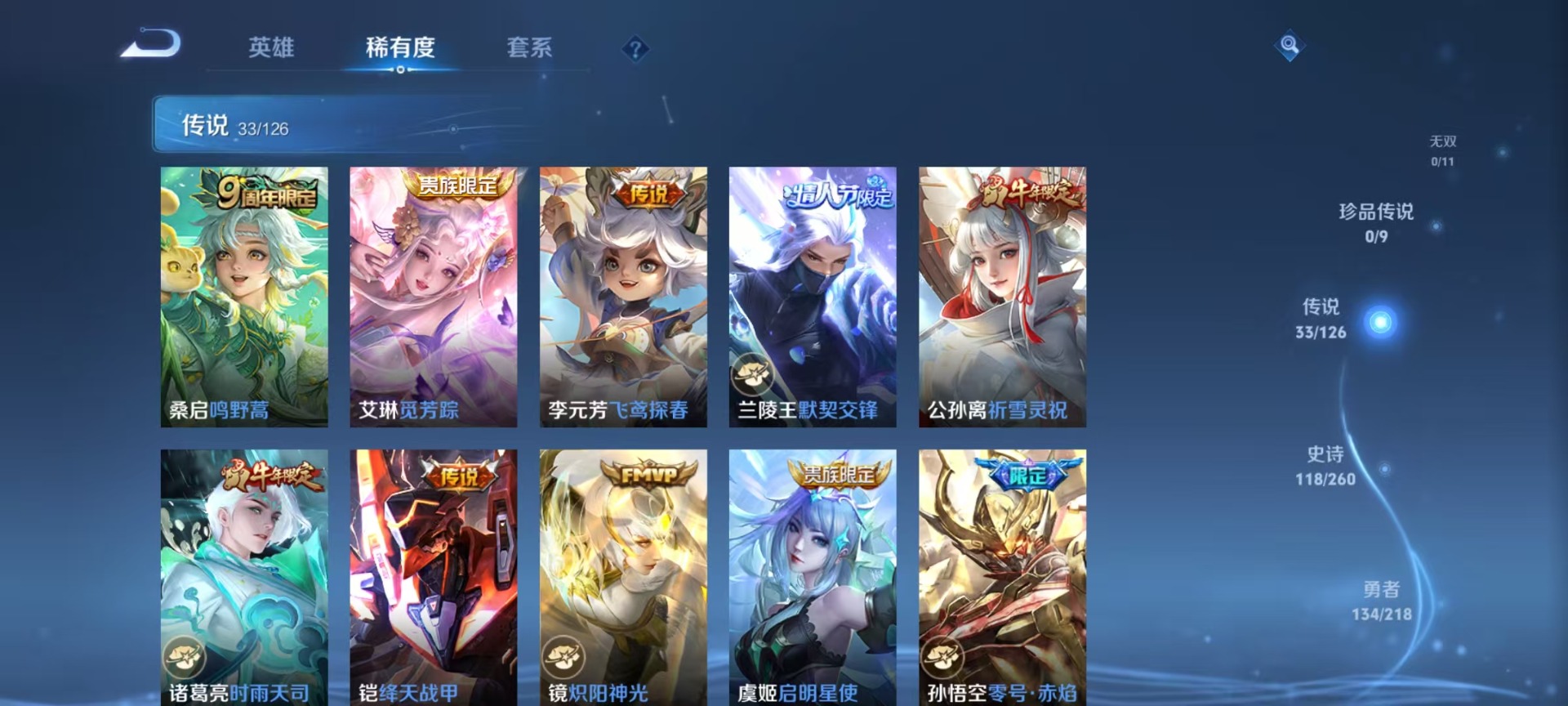 黄忠烈魂,铠青龙志,苏烈玄武志,张飞虎魄,赵云龙胆,孙膑天狼运算者,干将莫邪冰霜恋舞曲,牛魔奔雷神使,项羽霸王别姬,吕布御风骁将,后羿如梦令,后羿辉光之辰,露娜一生所爱,庄周云端筑梦师,诸葛亮时雨天司,兰陵王默契交锋,公孙离祈雪灵祝,貂蝉逐梦之音,裴擒虎李小龙,裴擒虎天狼狩猎者,东皇太一逐梦之光,上官婉儿天狼绘梦者,花木兰默契交锋,花木兰青春决赛季,安琪拉魔法小厨娘,马可波罗逐梦之星,桑启鸣野蒿,孙悟空大圣娶亲,芈月白晶晶,孙悟空至尊宝,百里玄策白虎志,马超神威,雅典娜神奇女侠,赵云引擎之心,韩信飞衡,韩信逐梦之影,蔡文姬奇迹圣诞,虞姬霸王别姬,嫦娥如梦令,关羽武圣,关羽冰锋战神