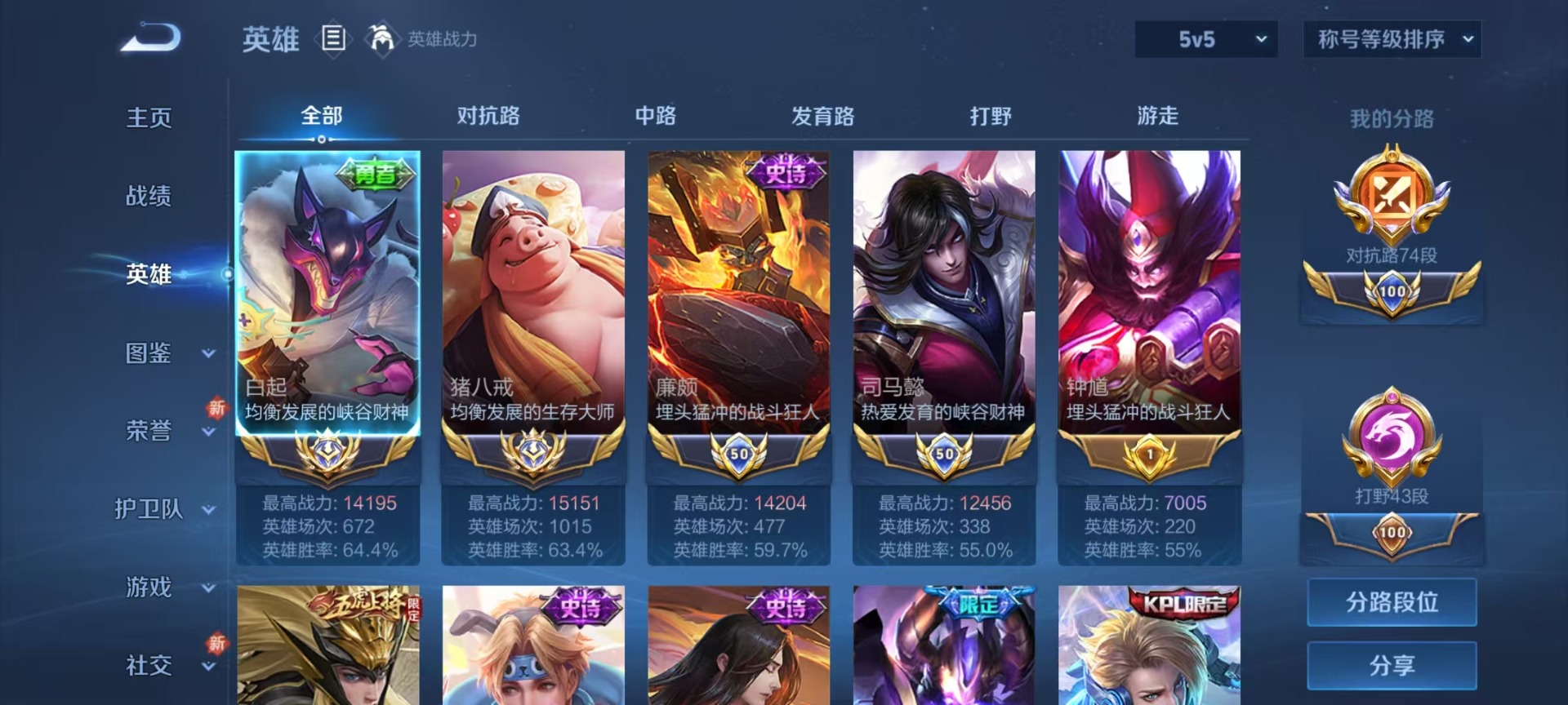 - PX_2100587-实名: 可修改 贵族等级: V7 英雄数: 124 皮肤数: 163 荣耀水晶: 星域神启 传说皮: 末日机甲-孙尚香,挚爱之约 限定皮: 游园惊梦,天狼溯光者,大圣娶亲,高山流水,孙行者,猪悟能,傲雪梅枪,百木心枪,玉兔公主