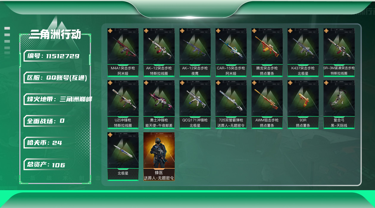 [11512729]总资产:106.1M 1干员外观 1近战传说 15传说枪械 哈夫币:24.467K 高级安全箱(9.17到期) 可二次 可修改实名 优质装备:近战-北极星 烽火地带段位:三角洲巅峰 全面战场段位:上等兵 传说武器皮肤:UZI冲锋枪-特斯拉线圈,AWM狙击步枪-捞点薯条,腾龙突击步枪-捞点薯条,93R-捞点薯条,AK-12突击步枪-特斯拉线圈,SR-3M紧凑突击步枪-特斯拉线圈,勇士冲锋枪-能天使-午夜邮差,复合弓-黑-天际线,K437突击步枪-北极星,QCQ171冲锋枪-北极星,725双管霰弹枪-送葬人-无题密令,M4A1突击步枪-阿米娅,CAR-15突击步枪-阿米娅,AK-12突击步枪-夜鹰 干员外观:蜂医-送葬人·无题密令(S5)