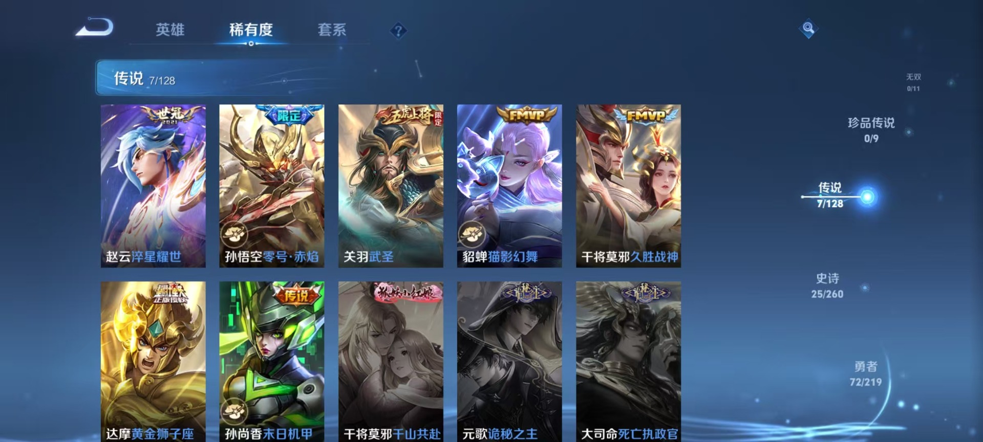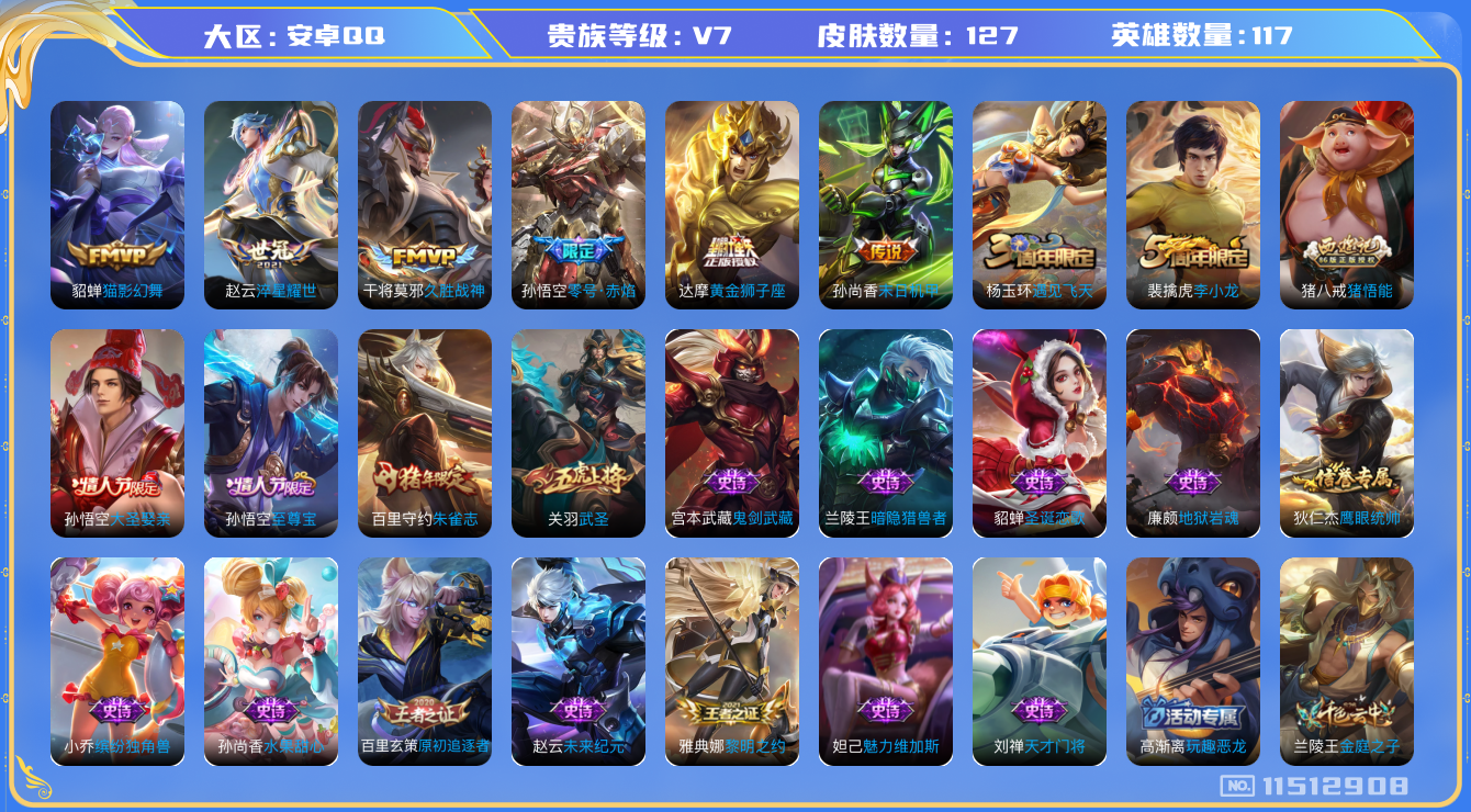 [11512908]V7 7传说 117英雄 127皮肤 可修改实名 优质装备:黄金狮子座,猫影幻舞,久胜战神,末日机甲-孙尚香(绿蚂蚱),零号·赤焰,淬星耀世 珍宝阁皮:玩趣恶龙 限定皮:至尊宝,遇见飞天,武圣,李小龙,朱雀志(守约年限),猪悟能,大圣娶亲 史诗皮:水果甜心,天才门将,暗隐猎兽者,鬼剑武藏,地狱岩魂,缤纷独角兽,原初追逐者,圣诞恋歌,鹰眼统帅,魅力维加斯,黎明之约,未来纪元-赵云