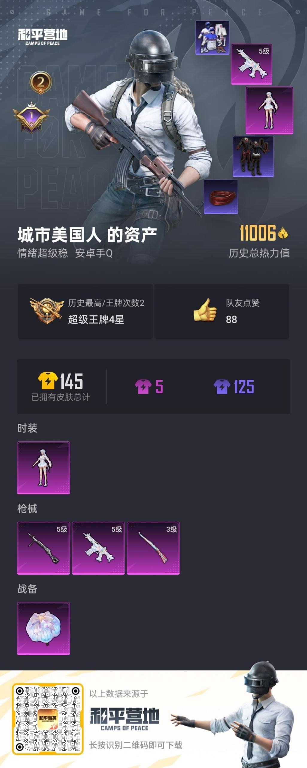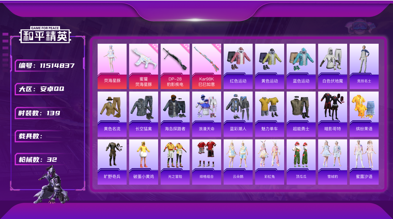 - PX_2107914- 安卓手Q-9王牌印记-5粉装-3特效枪-0载具-60124热力值-158套装-179枪皮-0卓越印记-0传奇印记 【5粉装】,宝贝奶油派,天使彩虹糖,炙焰红王,音爆索尼克,未来战士 【3特效枪】SCAR-L-青春物语-7级 M416-五爪金龙-7级 M249-彩虹甜喵-5级 【7稀有紫装】,萌熊伴侣背包(3级),奇异狩猎者,深海小丑鱼,浪漫天命,迅捷狂鲨,小丑鱼,萌熊伴侣