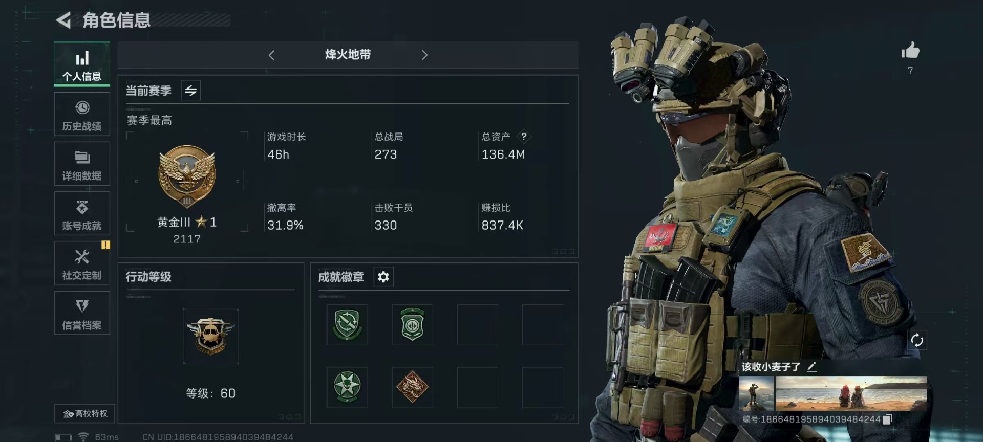 - [11578089]总资产:82.5M 1干员外观 1近战传说 25传说枪械 哈夫币:1.338K 顶级安全箱(3×3)9.15号到期 可二次 可修改实名 优质装备:近战-影锋,顶级安全箱(3x3) 烽火地带段位:黑鹰 全面战场段位:将军 传说武器皮肤:SCAR-H战斗步枪-水墨云图,M1014霰弹枪-影锋,AWM狙击步枪-影锋,SCAR-H战斗步枪-铁艺苍穹,SV-98狙击步枪-极速狂飙,Ash-12战斗步枪-极速狂飙,K437突击步枪-极速狂飙,SMG45冲锋枪-骑士,G18-飞虎,UZI冲锋枪-特斯拉线圈,AWM狙击步枪-捞点薯条,腾龙突击步枪-捞点薯条,93R-捞点薯条,AK-12突击步枪-特斯拉线圈,SR-3M紧凑突击步枪-特斯拉线圈,勇士冲锋枪-能天使-午夜邮差,Vector冲锋枪-能天使-午夜邮差,复合弓-黑-天际线,725双管霰弹枪-送葬人-无题密令,M4A1突击步枪-阿米娅,CAR-15突击步枪-阿米娅,AK-12突击步枪-夜鹰,M4A1突击步枪-蚀金玫瑰,CAR-15突击步枪-黑鹰坠落 史诗武器皮肤:Vector冲锋枪-潜袭者,K416突击步枪-暗鸦,M1014霰弹枪-暗鸦,P90冲锋枪-暗鸦,K416突击步枪-潜袭者,M1014霰弹枪-潜袭者,AK-12突击步枪-原型机(典藏),QBZ95-1突击步枪-ACE,AUG突击步枪-特勤执行,M4A1突击步枪-特勤执行,Vector冲锋枪-红色彗星,PTR-32战斗步枪-ACE,SKS射手步枪-ACE,AUG突击步枪-蝮蛇,M700狙击步枪-蝮蛇,PKM通用机枪-蝮蛇,SR-25射手步枪-战场英杰,Ash-12战斗步枪-守夜人,M16A4突击步枪-竞赛选手,P90冲锋枪-暗影猎手,PKM通用机枪-守夜人,AS Val突击步枪-尖端治疗,M700狙击步枪-守夜人,SG552突击步枪-尖端治疗,SR-25射手步枪-尖端治疗,M1014霰弹枪-林中猎手,MP5冲锋枪-深海恐惧,勇士冲锋枪-深海恐惧,SG552突击步枪-深海恐惧,AKM突击步枪-林中猎手,.357左轮-幸运时刻,QJB201轻机枪-Old Habits,QCQ171冲锋枪-禁卫,SR-3M紧凑突击步枪-纷争,SV-98狙击步枪-林中猎手,PTR-32突击步枪-英雄,AS Val突击步枪-典狱官,PKM通用机枪-荒野求生,M250通用机枪-囚徒