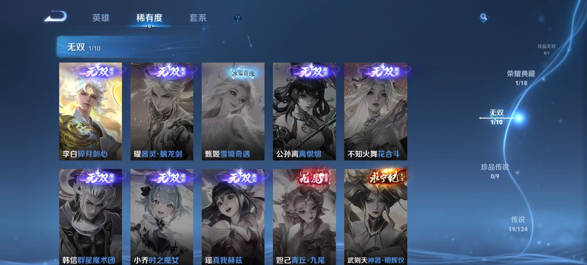甄姬幽恒,曹操天狼征服者,伽罗太华,典韦岱宗,后羿如梦令,后羿辉光之辰,庄周玄嵩,诸葛亮时雨天司,裴擒虎李小龙,裴擒虎天狼狩猎者,裴擒虎寅虎·赤拳,上官婉儿梁祝,上官婉儿神器·万象笔,李白诗剑行,马可波罗山海·玄木吟,桑启鸣野蒿,猪八戒猪悟能,孙悟空孙行者,孙悟空至尊宝,马超神威,妲己时之彼端,韩信飞衡,墨子降魔,嫦娥如梦令,王昭君凤凰于飞