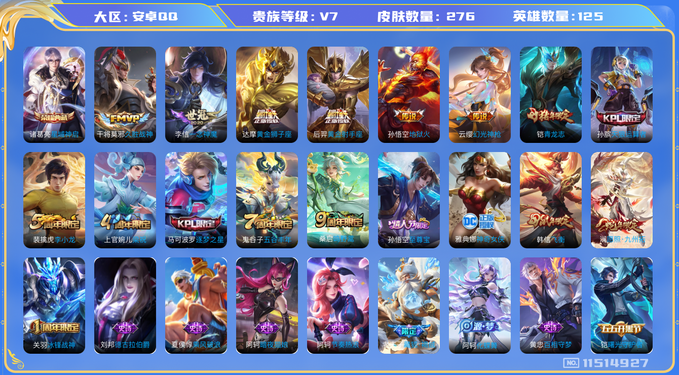 [11514927]V7 1典藏 8传说 125英雄 276皮肤 可修改实名 优质装备:星域神启(倪克斯贼亮),黄金狮子座,黄金射手座,久胜战神,一念神魔,地狱火 传说皮:幻光神枪 珍宝阁皮:妄想食味,胡桃夹子,蔷薇恋人 限定皮:愿照·九州拓(澜年限),鸣野蒿,至尊宝,飞衡(韩信年限),五谷丰年,青龙志(铠年限),冰锋战神,天狼运算者,梁祝,逐梦之星,李小龙,神奇女侠 史诗皮:鸭鸭历险记-刘禅,化蝶舞,星界战将,龙之律动,藏狐·褐绒,石田雨龙,百相守梦-黄忠,紫霞仙子,苍穹之光,白龙吟,黄金分割率,特工魅影,千年之狐,江河有灵,蒙恬荣光圣徽,偶像歌手,暗夜猫娘,猫狗日记-孙策,乱世虎臣,节奏热浪,修罗,女仆咖啡,水果甜心,绅士熊喵,天才门将,星夜王子,心灵骇客,功夫厨神,德古拉伯爵,暗隐猎兽者,幽灵船长,鬼剑武藏,心灵战警,天秀·启明,舞动绿茵,地狱岩魂,纤云弄巧,缤纷独角兽,乘风破浪,逐浪之夏,水晶猎龙者,曙光守护者,箭羽风息,金属风暴,原初追逐者,圣诞狂欢,圣诞恋歌,鹰眼统帅,暗夜贵公子,黎明之约,无心,未来纪元-赵云